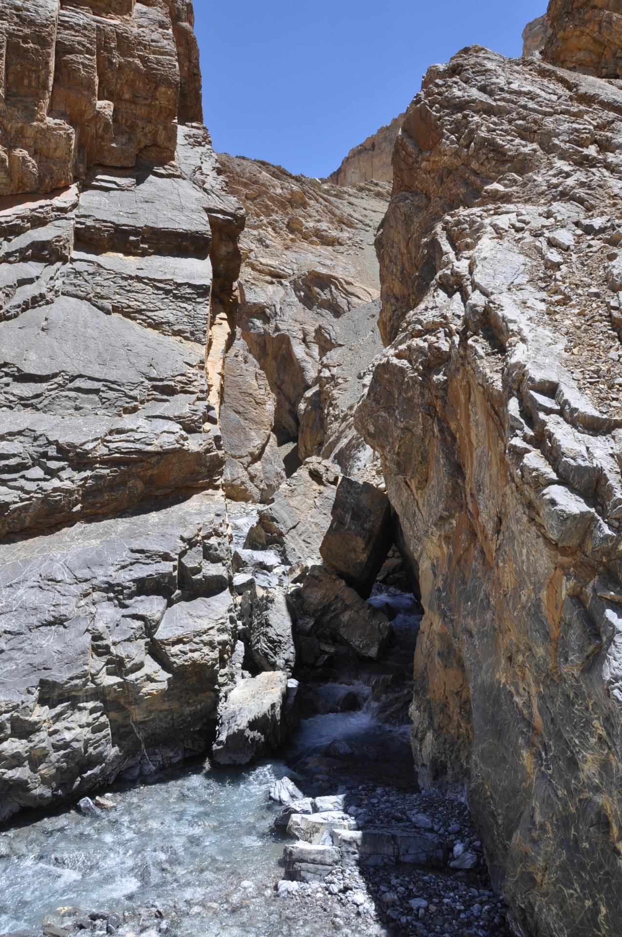 On peut désormais continuer notre progression tout heureux de découvrir qu'après 200m de canyon on peut poser le pied au sec sur un chemin parfaitement viabilisé et cairné. On remonte les pentes détritiques par de larges lacets quand tout à coup... plus de cairn ! Je déplie la carte pour constater que l'itinéraire d'accès au col doit remonter par un couloir en RG très délité et dans lequel les mules auront du mal à grimper. Par acquis de conscience je vais exporer le canyon d'où sort la rivière que l'on suit pendant que les "baroudeurs" zanskarpa essaient de trouver un chemin dans le couloir. "Chou blanc" de mon côté où après un goulet que l'on traverse à mi-cuisse la rivière dont je tente de remonter le courant ne propose que des traversées successives de chaos de rochers effondrés dans lesquels il sera pour les mules absolument impossible de progresser. Côté couloir, "chou gris"... Après avoir surmonté les premières pentes, Tundup et Donitchen ont bien identifié une trace horizontale qui partait du milieu du couloir sous la cascade et s'en allait rejoindre un collet dans une arête rocheuse. Mais le passage est vraiment trop dégradé pour que l'on s'y engage, hommes et mules, ne sachant pas de quoi les 300m restants derrière l'arête sont faits pour atteindre le Langpo La.