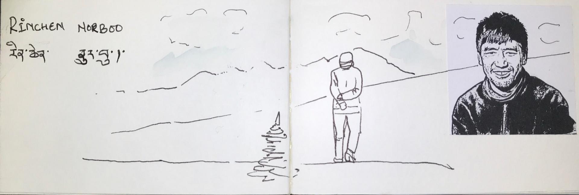 Claire qui m'a fait confiance l'année dernière pour la guider sur les "chemins" entre Sangtha et Mahe via le lac du Tsomo Riri (topos De Sangtha au Tsomoriri et Du Tsomo Riri à Mahe) m'a envoyé ces 3 aquarelles esquissées sur le vif et coloriées par la suite. Certes, je pense que mes clichés photographiques sont d'une bonne qualité (je prends toujours du plaisir à les regarder même bien des années après avoir réalisé le trek) mais là je suis bluffé par ses aptitudes à créer ces oeuvres d'art comme ça, en live... Vous reconnaîtrez celle du lac du Tsomo Riri depuis le Norbu La, puis celle de notre guide Rinchen, super bien "croqué" et puis votre serviteur dans des poses récréatives ou sérieuses (il faut bien noter ce que l'on voit pour pouvoir composer un topo de qualité, non ?). Les voici donc :