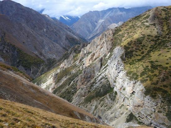 Pour nous, la journée de marche, c'est celle des up / down, et pas qu'un peu ! Que des parcours sur des sentiers-balcons audacieusement tracés sur les flancs de pentes détritiques au-dessus de canyons profonds. Quelle beauté encore, et des paysages qui changent encore une fois pour passer à des pentes gazonnées. On aura l'occasion de pouvoir revoir le chemin parcouru depuis 10 jours d'un seul coup d'oeil et là, on se dit que voir les montagnes si proches alors que l'on a mis tant de temps pour faire le voyage, c'est que l'on est bien petit dans cet espace naturel gigantesque !