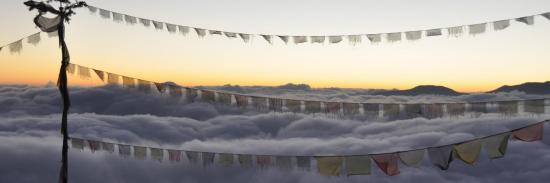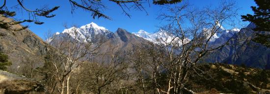 Décembre 2014 s3 : Oui, oui, je suis revenu... Après 48 jours de marche dans des paysages aussi variés que la campagne népalaise du côté de la Sun kosi, puis la création d'un nouvel itinéraire de trekking entre les portes du Rolwaling (Charikot) et du Khumbu (Lukla) qui enchaînera quotidiennement pendant une vingtaine de jours les panoramas d'exception sur la chaîne himalayenne (confidentiels car je pense que je ne suis pas loin d'avoir été le premier à envisager, et à réaliser, cette liaison d'W en E en suivant le piémont), pour terminer en apothéose par un trek très alpin passant au pied du Mera peak, franchissant des cols de très haute altitude comme le Mera La, l'Amphu Labsa et le Kongma La pour atteindre le fond de la vallée du Khumbu glacier au pied de l'Everest par l'ascension de la petite butte du Kalapattar. Tout cela vous le découvrirez dans les jours qui viennent au fur et à mesure que je mettrai en ligne les topos accompagnés de quelques photos en illustration. Comme d'hab', les diaporamas arriveront un (tout petit...) peu plus tard... En attendant, le panoramique d'invitation à patienter a été réalisé sur la crête qui relie le village de Lachhewar au site du lac de Dudh pokhari situé au pied du Numbur. La mer de nuages sur le Teraï est tout à fait normale en cette saison. Le seul inconvénient est qu'au fur et à mesure que le soleil la réchauffe, elle prend de la hauteur et envahit peu à peu les vallées du piémont himalayen faisant en sorte qu'au milieu de la journée on évolue dans la "purée de pois" jusqu'à ce qu'elle régresse à l'approche du coucher de soleil. Et là c'est un peu beau !