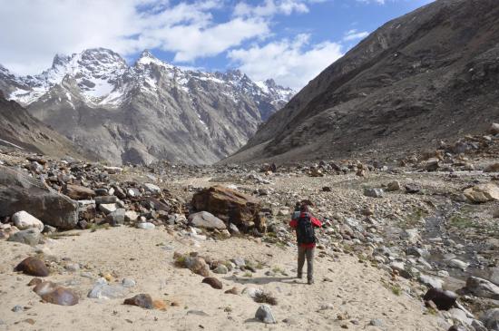 De la plateforme gazonnée on part franchit un collet au milieu de blocs avant de descendre juste derrière rejoindre un alpage où paissent des yacks (10mn, 4125m). Puis on traverse une étendue de cailloux avant de bifurquer sur la G pour emprunter une allée entre deux moraines caillouteuses en direction du vallon qui s'ouvre sur la gauche. On s'élève à flanc de falaise sur des rochers effondrés et on peut apprécier au loin l'extrémité du Malung glacier qui présente des séracs grisâtres. La montée n'est pas très pentue mais le terrain n'est pas fait pour que l'on puisse conserver un rythme puisque l'on doit parfois chercher son itinéraire au milieu des blocs qui se chevauchent. On atteint enfin le verrou morainique agrémenté d'une pelouse alpine bien rase (1h, 4350m) ouvrant la vue sur un nouveau complexe glaciaire au pied duquel on va à présent se diriger. On part légèrement sur la D pour s'en aller emprunter un audacieux "pont de pierres", là encore bénéficiant d'un chaos rocheux et sous lequel rugit le torrent boueux. Puis on traverse un espace d'alpages jusqu'à arriver auprès d'une source qui sourd d'une moraine latérale (25mn, 4400m). On poursuit en direction du fond de vallée où la trace parfois cairnée aide à trouver le meilleur passage entre les blocs effondrés et les minuscules prairies présentes autour des sources qui jaillissent de partout. Vers 4480m on s'écarte du lit du torrent pour monter sur la D passer un collet et juste derrière atteindre Hinju Pullu (1h, 4575m) situé au confluent de deux vallées glaciaires et où l'on établit le camp (emplacements pour plusieurs tentes, petite maison à 2 pièces pouvant servir d'abri).