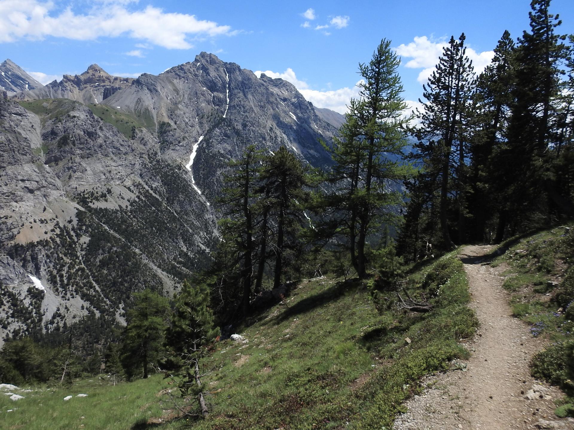 A l'approche de la cheminée de fées (1h, 1880m), on doit traverser un double thalweg détritique puis on retrouve juste après le GR5 qui arrive de la gauche en provenance de la chapelle des Âmes de Névache. On poursuit tout droit en suivant le balisage blanc-rouge. On enchaîne les lacets courts en forêt jusqu'à sortir à découvert et prendre pied sur le rebord du plateau des Thures (30mn, 2050m). On laisse le GR5 poursuivre vers le N en direction des chalets des Thures et au-delà la Vallée Étroite pour monter à main D au NE traverser une prairie puis croiser le sentier support du GR5B.