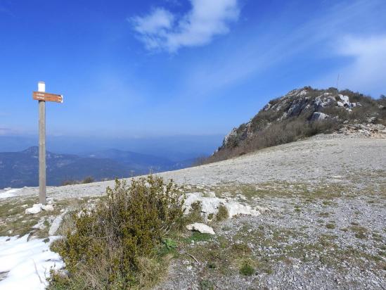 On laisse à main droite la statue pour poursuivre tranquillement jusqu'à la piste qui arrive de Ganges (40mn, 670m, poteau indicateur « La Signole », antennes télécom). On suit la piste terreuse sur la G jusqu'à l'entrée d'un large virage vers la gauche (25mn, 795m) où l'on remarque un cairn posé sur un rocher orné de marques de peinture bleue et rouge. On s'engage à D sur le sentier qui va nous conduire au travers d'une garrigue arbustive jusqu'au pied du deuxième groupe d'antennes qui marquent le point culminant de la montagne de la Séranne. Pour ce faire, on tiendra compte exclusivement du « balisage » de couleur bleue (les maarques rouges identifiant probablement des limites de parcelles...) jusqu'à 875m d'altitude avant qu'on ne les laisse partir vers la droite alors que l'on continue tout droit au milieu des herbes folles avec les antennes en point de mire. Un peu plus loin, on retrouve au sol quelques balises à moitié effacées d'un antique tracé de GR de Pays, aujourd'hui dérouté. On débouche sur la piste en contrebas des antennes (30mn, 925m). On poursuit à D en montée pour dépasser les premières antennes et rejoindre la plateforme qui s'inscrit au pied des secondes (5mn, 940m, poteau indicateur).