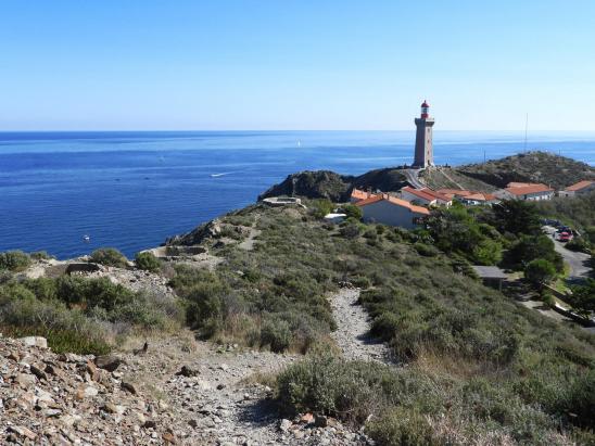 On évolue sur un bon sentier à hauteur du rivage avant de croiser le sentier qui relie le fort Béar au sémaphore que l'on distingue maintenant tout à l'E. On emprunte le chemin vers la G et par une légère descente on s'en vient croiser la route devant le sémaphore (25mn, 75m). Le sentier littoral se poursuit le long du grillage de protection du sémaphore. On atteint le parking automobile du phare de Béar (5mn, 50m). Possibilité de faire l'A/R sur le sentier pour se rapprocher au mieux du bout du bout...