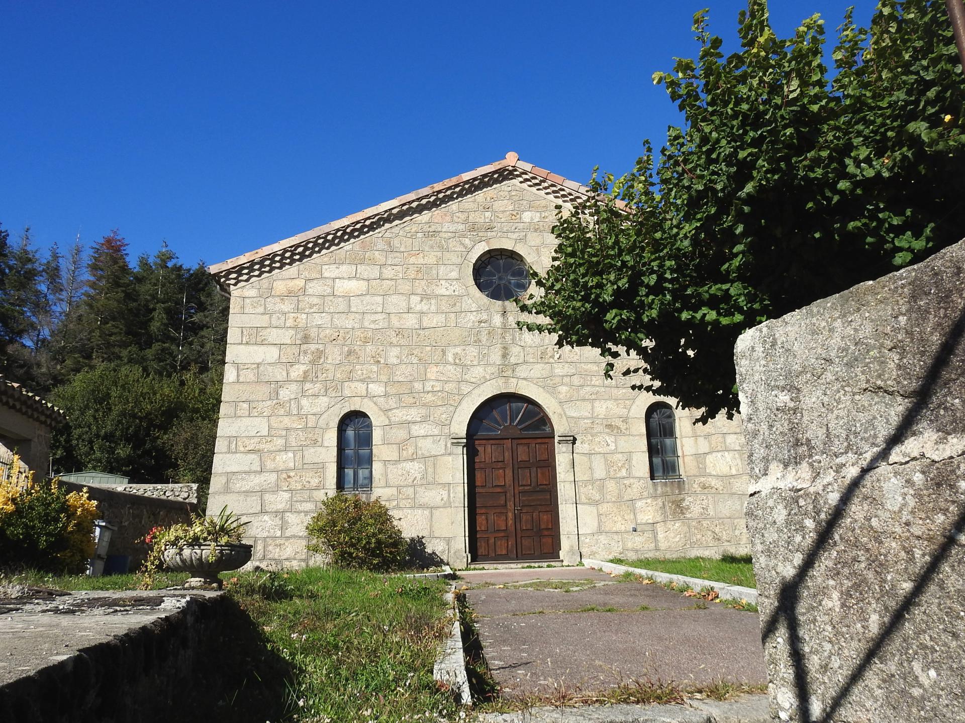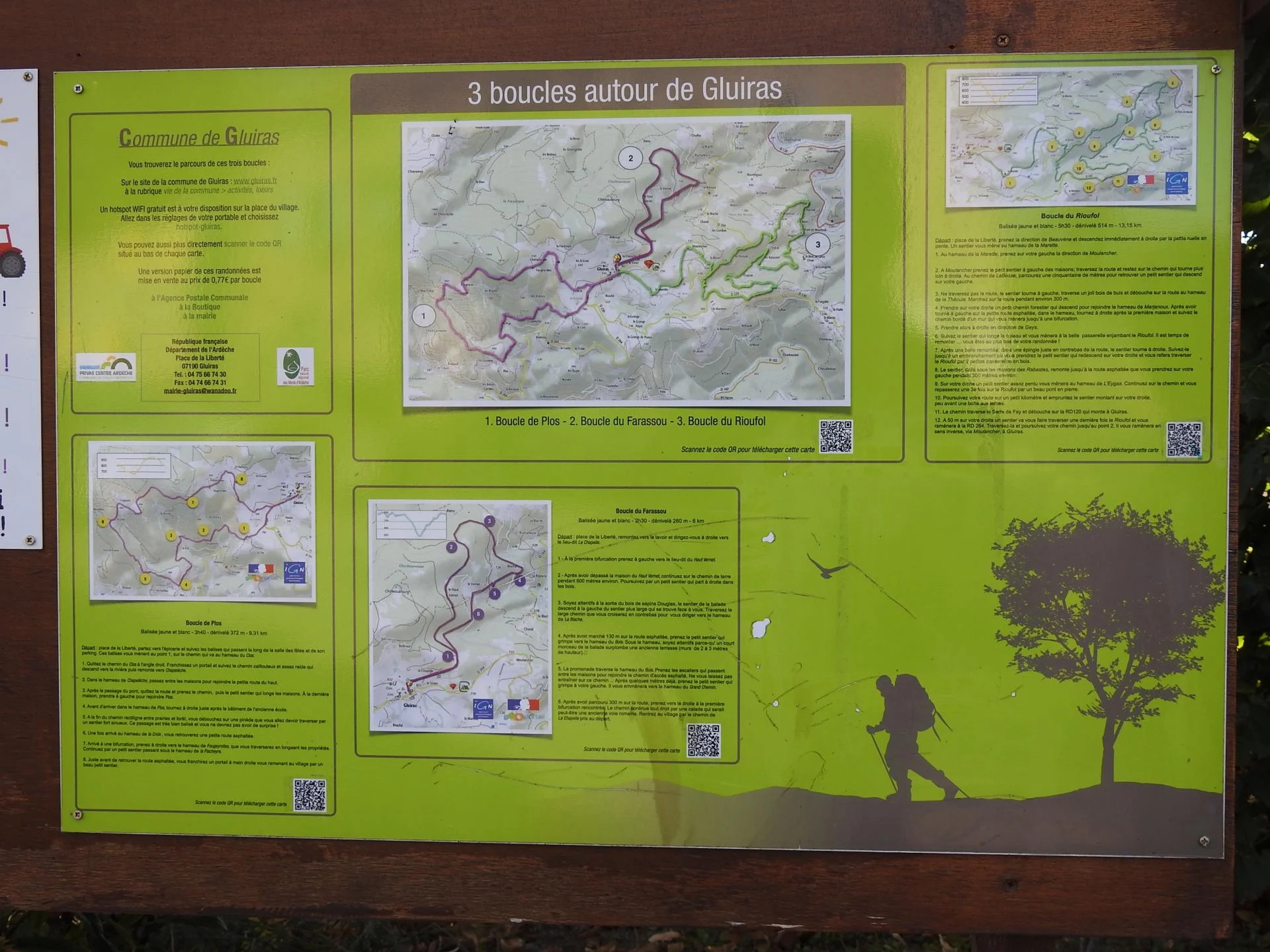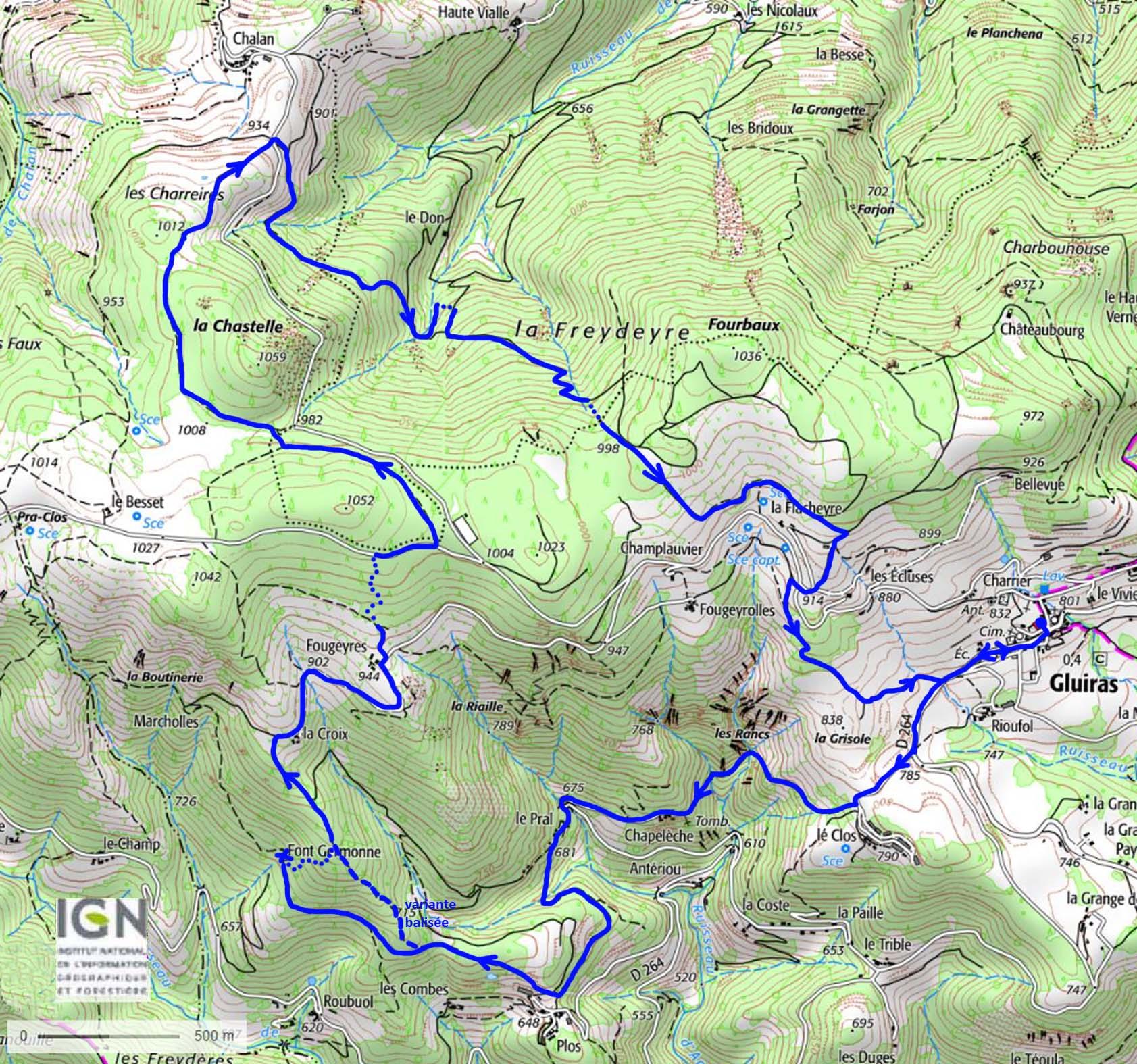On traverse le hameau de Chapelèche avant de s'élever à D par quelques marches d'escalier pour rejoindre la route d'accès goudronnée et on la suit à G en légère descente jusqu'à atteindre le hameau du Pral (25mn, 665m). A la sortie du hameau, côté S, un panneau directionnel invite à emprunter sur la G une calade qui descend traverser un thalweg avant de rejoindre le hameau de Plos par un sentier-balcon sur la vallée de la Glueyre (20mn, 650m). A l'arrière de la 1ère bâtisse, on incline sur la D pour passer devant la captation d'eau et suivre le petit sentier balisé en blanc-jaune qui remonte la large crête boisée vers l'W en direction de Fougeyres.