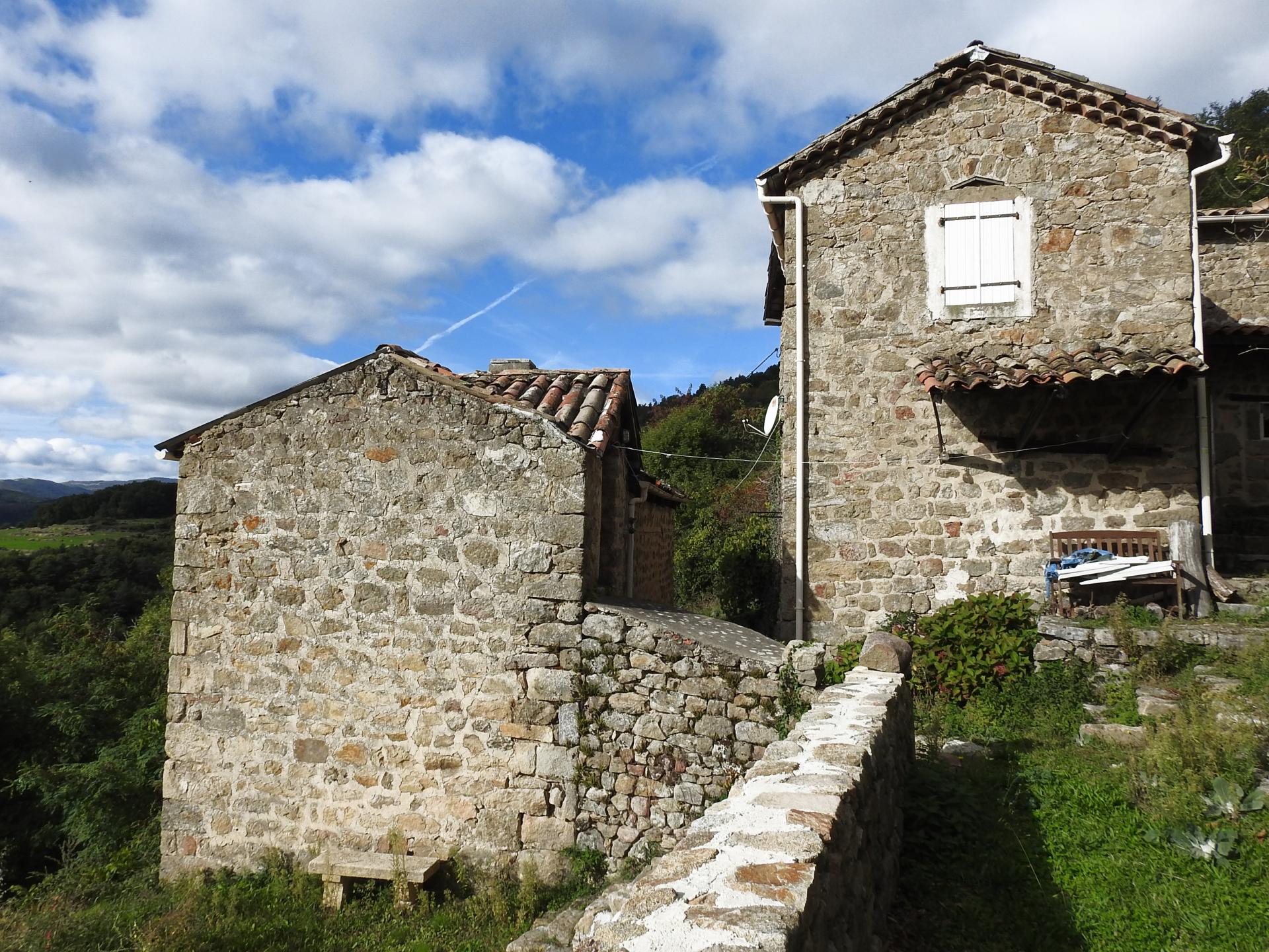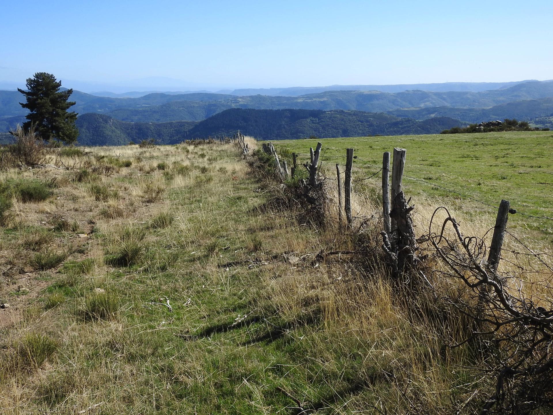 On laisse le le sentier balisé se poursuivre en montée sur la droite (on peut aussi le suivre...) pour continuer à hauteur sur un large chemin un peu encombré qui débouche dans une clairière avec une belle vue au SW, là aussi, sur la vallée de la Glueyre. On incline un peu sur la D pour atteindre l'entrée de la propriété privée de Font Germonne, un maison forestière aux murs épais construits avec la pierre volcanique du coin. On remonte "dré dans l'pentu" le coteau façonné en terrasses sur la D pour rejoindre, quelques dizaines de mètres de dénivelée plus haut, un large chemin herbeux que l'on suit sur la D pour atteindre un portail bleu et le franchir afin de reprendre la marche vers la G sur le sentier balisé que l'on a laissé plus bas (40mn, 815m). On rejoint ainsi un nouveau portail que l'on emprunte afin d'accéder à la piste qui arrive du Pral (ne pas tenir compte du balisage directionnel positionné en amont qui indique beaucoup trop longtemps à l'avance qu'il va falloir tourner !).