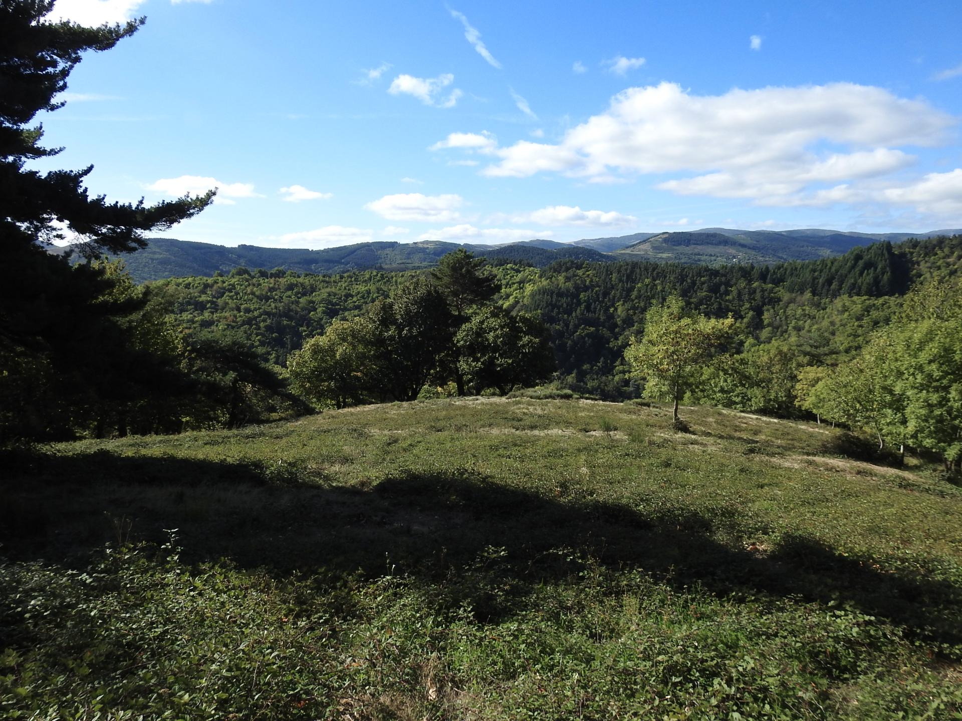 Une fois arrivé dans le large col à 1010m, on retrouve la piste et on la laisse partir dans la pinède sur la gauche alors que l'on suit au SE un large chemin qui descend directement vers la ferme de La Flacheyre. A l'horizon E, on peut distinguer le Grand-Veymont, les Trois-Becs et la montagne de Couspeau. Plus à droite, on identifie les montagnes d'Angèle, de Miélandre, de La Lance et jusqu'au Mont-Ventoux. Au S, c'est bien l'échancrure bien large du col de l'Escrinet que l'on peut contempler. Permettant de passer des bassins versants de Privas à celui d'Aubenas, il est gardé à sa gauche par la crête de Blandine (et sa flopée d'antennes télécom...) et le Roc de Gourdon.