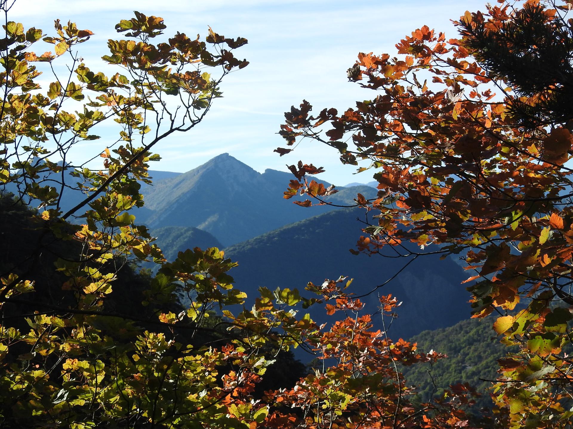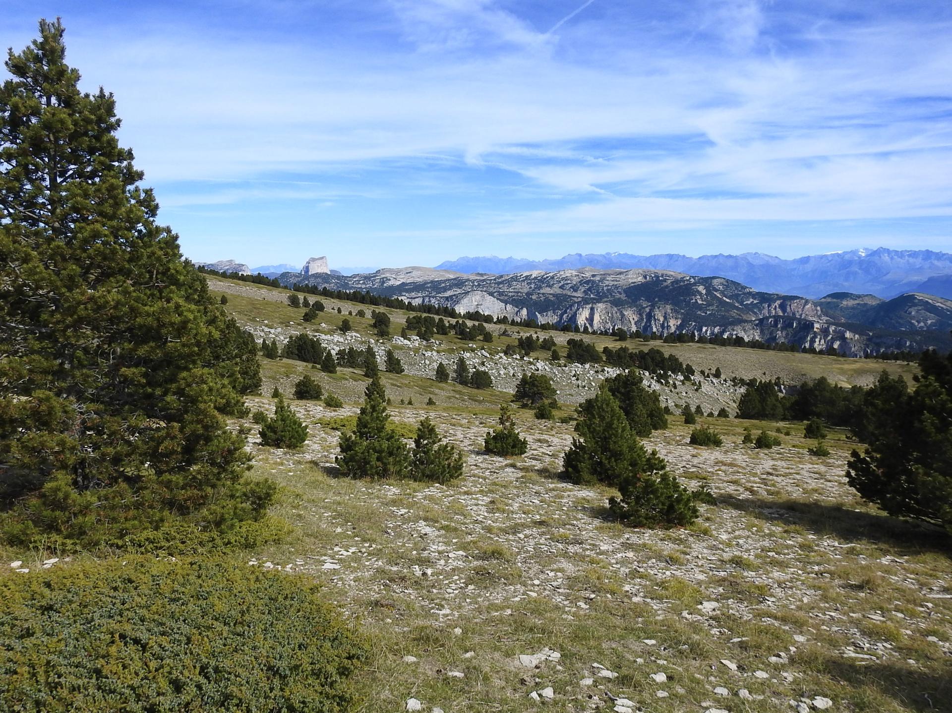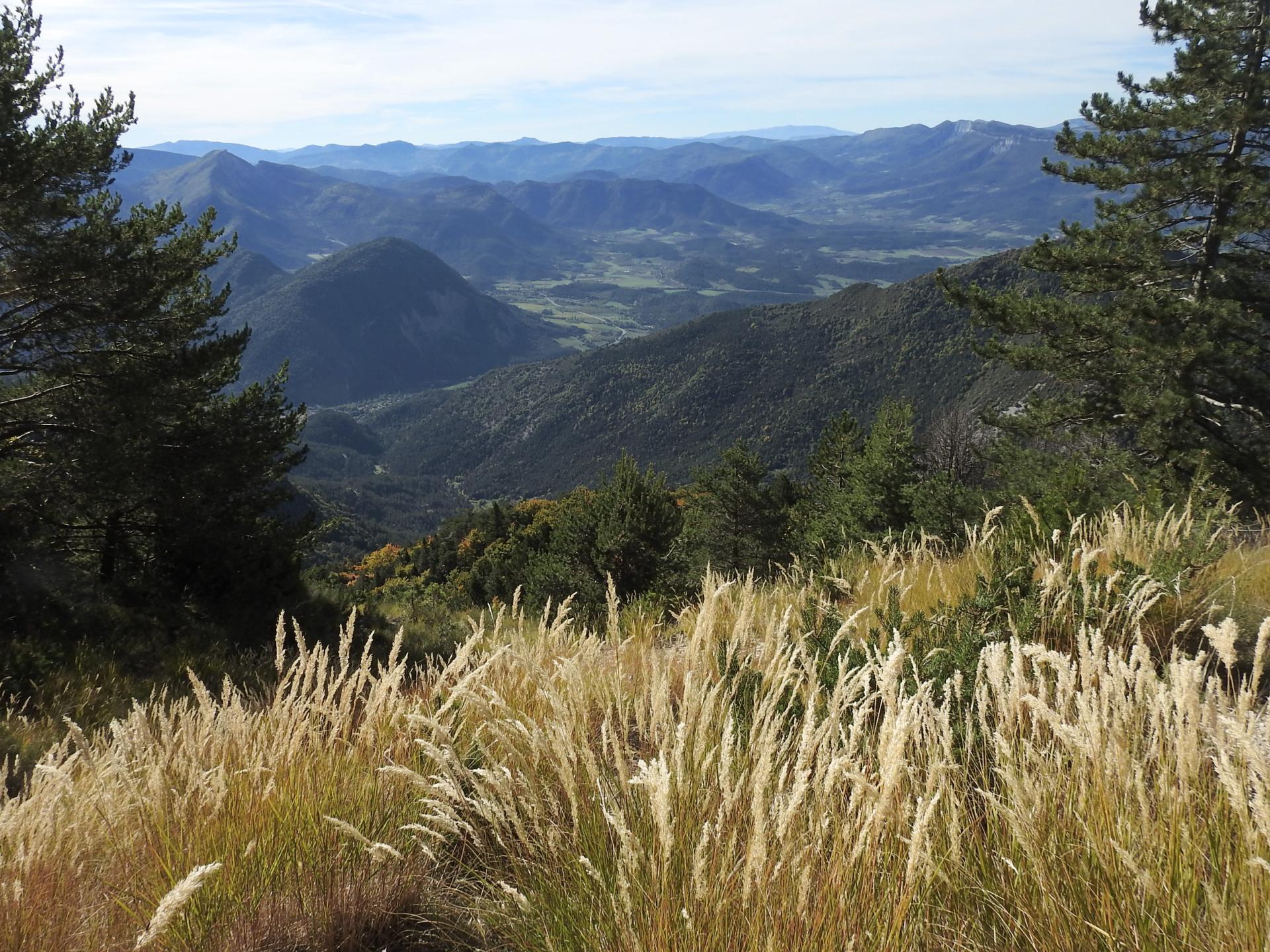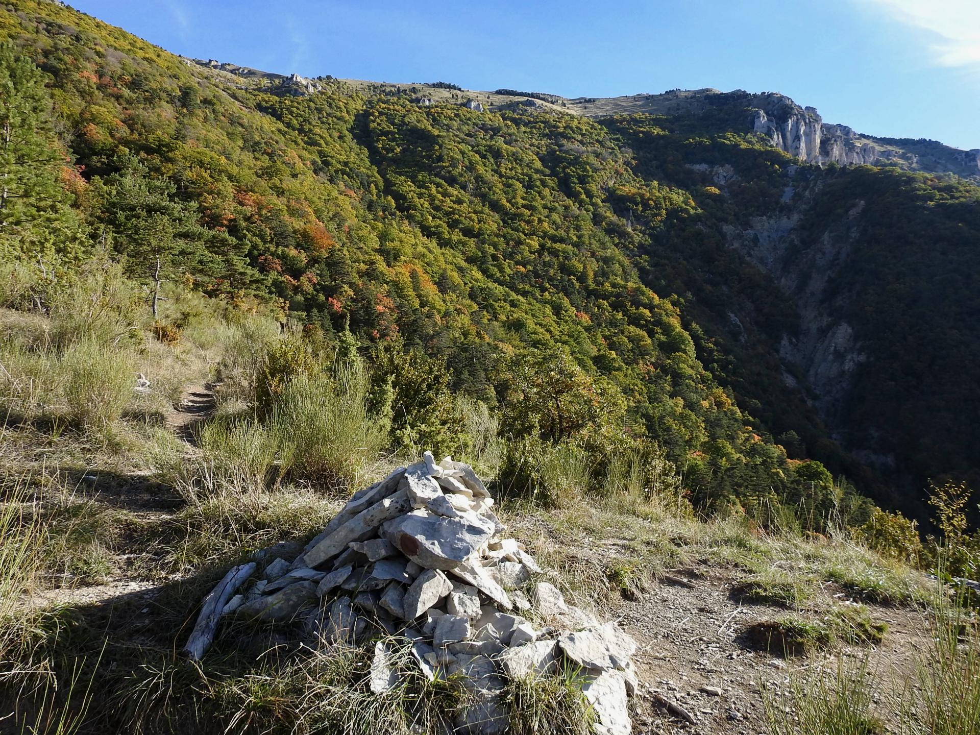 On reprend le fil du chemin quiasiment à découvert à présent. La pente se fait plus marquée pour rejoindre une hêtraie dans laquelle le sentier poursuit sa course vers l'E sur un tapis de feuilles mortes. Voici que l'on arrive à l'entame de la dernière partie de la montée : certes, le sentier est très bien tracé et traverse la combe rocailleuse en biais mais le coteau s'est redressé et on sent le millier de mètres que l'on vient de grimper... Le plateau sommital n'est plus très loin et les paysages proches et lointains sont dignes d'être dégustés lors des courtes pauses reprise de souffle que l'on peut s'octroyer. L'horizon s'inscrit au-delà du Diois de la montagne de Lure au Mézenc en passant par Valdrôme, le Mont-Ventoux, la Servelle, Angèle, Miélandre, la Lance, Couspeau, les Trois-Becs tandis qu'au premier plan on trouve La Grésière, les montagnes de l'Eyriau, de Praloubeau, de Boutarinard, d'Aucelon, la Pâle, le sommet de la Plaine et le Grand-Justin.