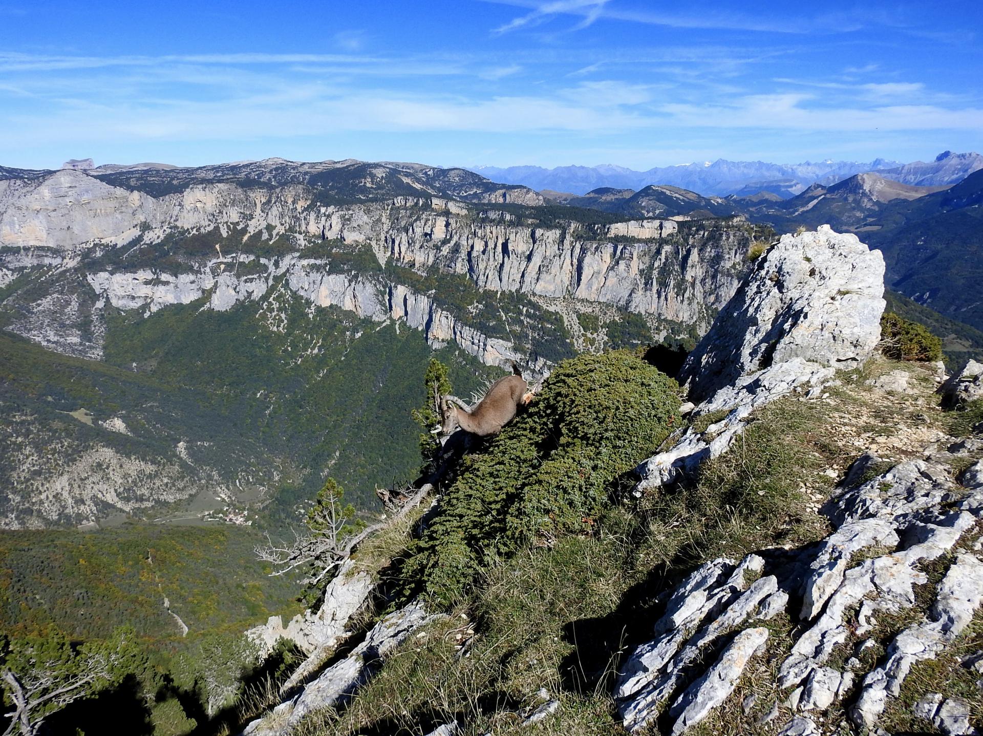 Voici une belle bambée qui a pour but l'un des sommets de la montagne du Glandasse, ce haut plateau vertacomicorien (ou vercusien...) qui surplombe le Diois. On va laisser de côté le GR91, du moins pour la montée..., pour emprunter l'un des itinéraires alternatifs non balisés qui permettent d'accéder au plateau sommital : entre Die et Châtillon-en-Diois, il en existe une demi-douzaine. Celui que j'ai choisi pour faire l'ascension du Roc d'Ambane, un sommet proche du Pié Ferré, le point culminant du Glandasse, est le sentier qui passe par la fontaine des Tuiles. La montée est étonnamment peu affirmée bien que ce sont plus de 1100m qui séparent le village de Châtillon-en-Diois du col de la Raille et encore 250m pour rejoindre le sommet convoité... Un excellent sentier qui propose de larges lacets sans grosses montées à l'exception des 200 derniers mètres de grimpette au-delà de la fontaine des Tuiles, plutôt relevés. A l'automne, c'est un bonheur que d'évoluer dans ces pentes qui alternent forêts de feuillus (principalement du hêtre et de l'érable), sapinières (pas beaucoup...), cédraies et prairies d'herbes folles. Que dire des panoramas ? Immenses...!