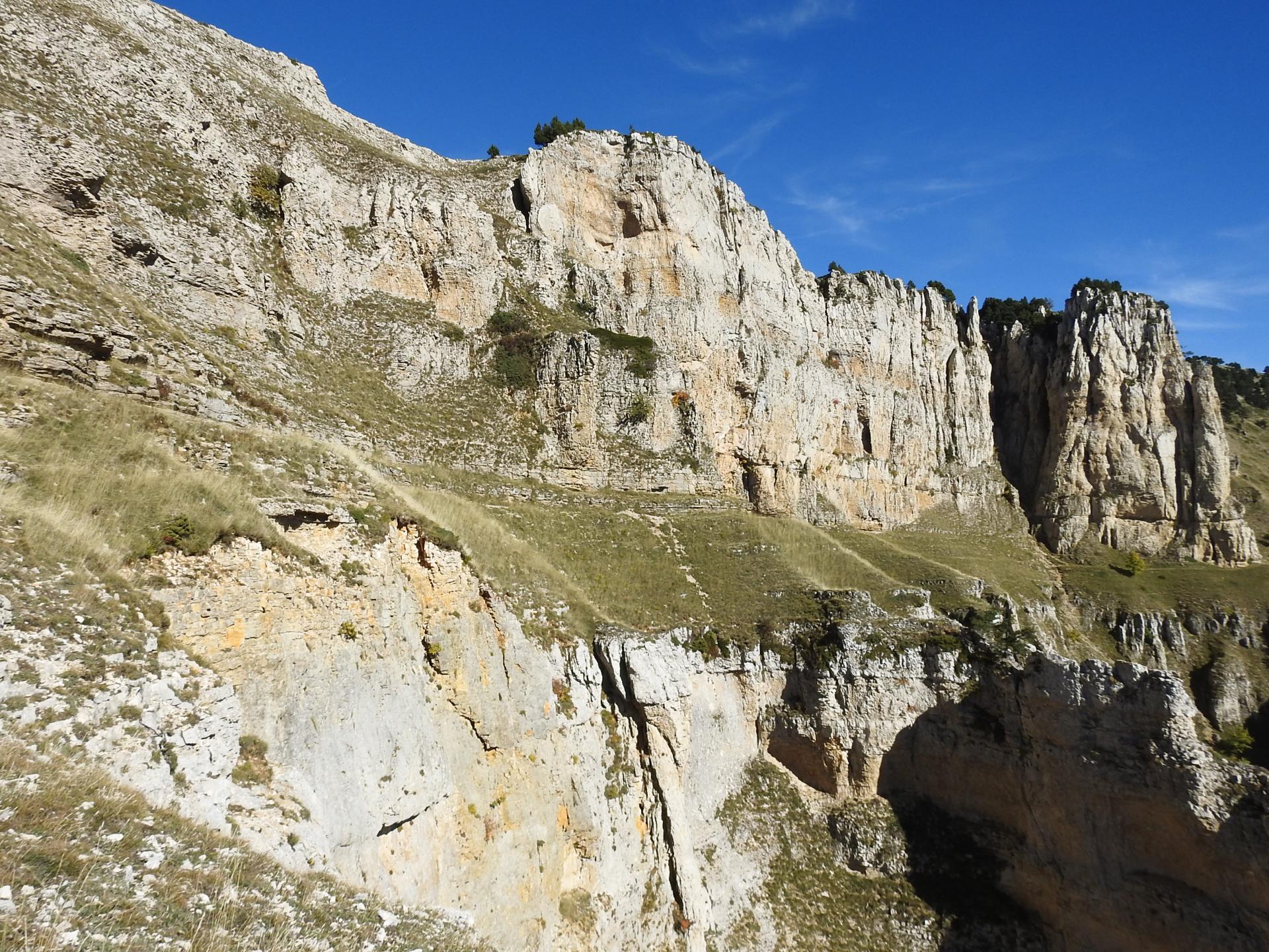 Du belvédère, on descend contourner les cabanes puis on poursuit vers le S pour passer à proximité du gouffre du Grand Assiriau et retrouver le GR91 qui propose une petite montée jusqu'au cairn qui marque le passage sur le rebord méridional du plateau. On suit les marques blanches et rouges qui descendent à flanc sous les falaises de Baume Rousse. Si l'on n'a pas besoin de refaire le plein d'eau pour les 2h30 de descente jusqu'à Châtillon-en-Diois, on poursuit sur la D pour négocier le premier virage et se retrouver face au Roc d'Ambane. Sinon, un cairn indique que le chemin étale qui suit la vire de Baume Rousse conduit en 2mn à une fontaine.