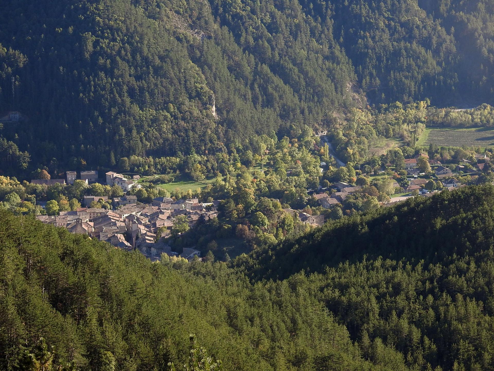 Et c'est parti pour une descente en assez forte déclivité ne présentant qu'assez peu de périodes de récupération (à l'exception notable de la dernière demi-heure où l'on suit de larges lacets sans déclivité notable...). Parfois caillouteux, le sentier est très emprunté mais il faut quand même garder un oeil sur le balisage car on croise beaucoup de chemins de traverse et ce serait dommage de perdre du temps dans des détours inopinés et non consentis... Au mitan de la descente, on passe au Serre des Granges (1h15, 1155m) avant de croiser la piste forestière d'Archiane (5mn, 1122m). En face, c'est reprise de la descente (bobo les genoux...!) jusqu'à la forêt annoncée et ses larges lacets. On débouche à la sortie du vallon de Baïn au N du village (1h05, 615m). Ici il ne reste plus qu'à remonter sans effort la piste vers le N pour retrouver le parking du cimetière (5mn, 625m) et en terminer avec cette merveilleuse journée.