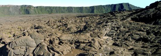 A la sortie du refuge prendre le petit sentier qui monte à gauche pour rejoindre en ¼ h le Pas de Bellecombe où l’on trouve le seul chemin qui permet de descendre dans l’enclos. 110 mètres plus bas, on pose le pied sur les plaques de laves anciennes. On est tout proche d’un petit cratère à la bouille sympathique : le Formica Leo (s’il vous plaît, arrêtez de monter dessus, il n’y a rien à voir de plus et cela accélère son érosion). Depuis l’effondrement du cratère Dolomieu suite aux gros épanchements de lave au début 2007, le touriste n’est plus autorisé à monter sur la cîme à 2632 m (panneaux), ni faire comme auparavant le tour des cratères sommitaux à cause des risques réels de fracture et des éboulements. C’est un véritable danger, n’y allez pas ! L’ONF a ouvert deux sentiers de remplacement : le premier, à gauche, conduit vers le piton de Crac en 2h A/R, le second, à droite, vers un belvédère sur le Château-Fort en 4h A/R. Pas de raison d’être déçu ! Prenons le second et suivons au sol les marques de peinture blanche. Nous marchons principalement sur de la lave cordée (les pahoehoes, prononcer payoyo), traversons plusieurs coulées anciennes mais aussi des récentes, la plupart en grattons (les aas).