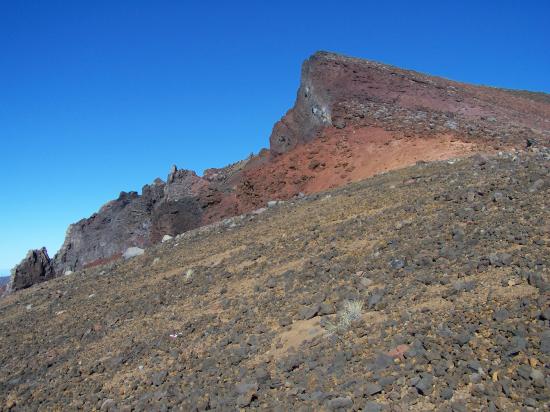 Au bout de 3 heures de montée, vers 1700 mètres d’altitude, le sentier passe à découvert pour louvoyer entre les plaques de lave. Les premiers petits cratères volcaniques apparaissent bientôt. Poursuivant la montée, l’inclinaison devient moins forte et comme point de mire les puys Ramond. En approchant, on pénètre peu à peu dans un site d’une grande splendeur et très coloré ; cela va du rouge du gravier des cônes, du noir des cendres à la blancheur des buissons sous un ciel d’un bleu azur. Les quelques brumes qui se forment en cette fin de matinée lui confèrent une ambiance mystérieuse.