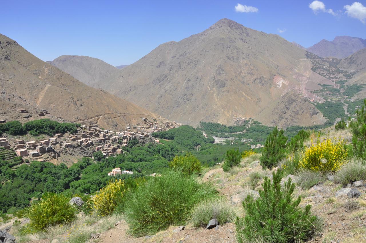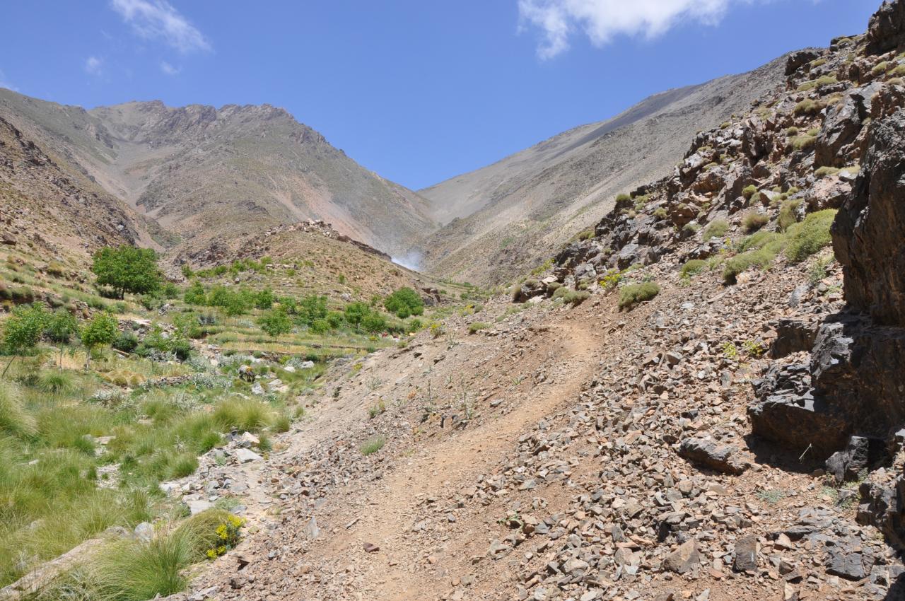 On part en RD de ce cloaque nauséabond qu’est devenu l’oued Nfis à cet endroit avant de franchir un pont et filer sur la G sur une piste très peu empruntée. On marche à mi-hauteur dans une superbe vallée bordée de part et d’autre d’une forêt clairsemée de cyprès. Le lit du torrent est colonisé par les nombreux buissons de lauriers roses tandis que les terrasses cultivées au pied des villages que l’on traverse sont plantées de noyers et d’amandiers. On passe Ouizemmarn (40mn, 1705m) puis Imlil (30mn, 1780m). La piste RG se termine ici mais un sentier balcon prend la suite. Son départ se trouve à l’W du village. On le rejoint en s’engageant à droite de la mosquée sous une maison porche puis en louvoyant entre les maisons anciennes par de petites ruelles. Juste avant la source du village, les mules descendent traverser l’oued Nfis sur un pont pour emprunter la piste en RD, le sentier historique de la RG se trouvant par moment bien érodé...