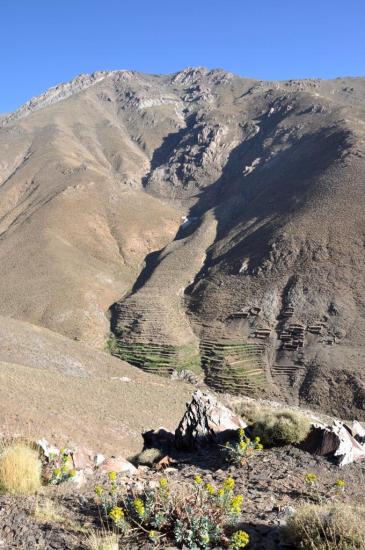 Diaporama On remonte la piste au milieu d’un paysage bucolique de vallon agraire. On est protégé du soleil sous les frondaisons des noyers. Trois lacets de la piste conduisent au village perché de Tizga (1h, 1960m). On poursuit dans les ruelles pour atteindre les maisons hautes et trouver sur la gauche au niveau de la fontaine le départ du sentier de Talat n’Rhâ. Le sentier pénètre dans un vallon assez étroit et disparaît par moment au milieu des jardins. On suit le canal d’irrigation avant de retrouver le sentier en RG de la vallée. On passe une source (25mn, 2065m) juste avant de longer une maison isolée (délicieuses cerises en juin…). Le vallon se rétrécit obligeant à marcher dans le lit du petit torrent mais sur un sentier toujours présent. Le vallon se transforme peu à peu en une gorge étroite qui s’ouvre peu après dans une large combe (30mn, 2275m, source en RG). On poursuit toujours vers le haut jusqu’à un large vallon dans lequel ont été construites des terrasses où sont plantés courgettes, oignons et pommes de terre (10mn, 2370m). Le fond de ce vallon est clos par l’imposante muraille du Jbel Imlit dont le point culminant mesure tout de même 3245m.