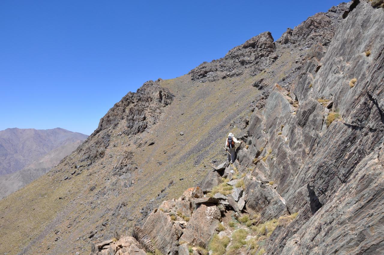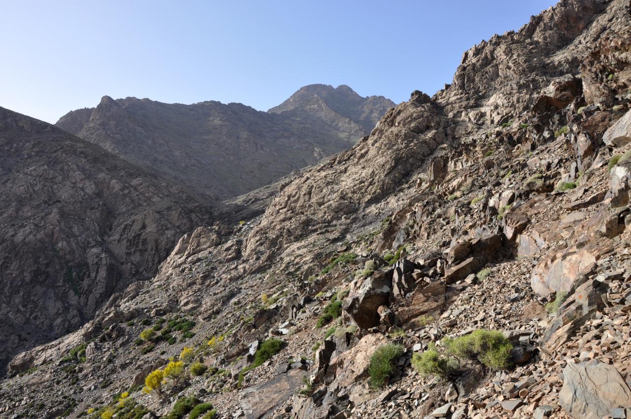 N°2 – Descente au S en direction du col. Ne pas aller jusqu’au col mais tourner sur la G dès les barres rocheuses franchies afin de suivre le bas de l’arête et rester en RG à hauteur du fond du thalweg qui plonge rejoindre le haut de l’assif Lahlou. Avant que l’épaule ne plonge elle aussi vers le fond du vallon, passer une échancrure entre deux schistes dressés pour entrer dans un deuxième vallon. Perdre un peu d’altitude en visant une nouvelle échancrure dans une deuxième arête rocheuse donnant accès celle-là à… une falaise dans laquelle il faut pratiquer avec quelque attention des pas de II (une cinquantaine de mètres en traversée avec un peu de gaz, peut se contourner par la base mais cela fait faire un détour pas si innocent que ça…). Après cet unique passage délicat, descente abrupte entre touffes d’épineux et petit éboulis en diagonale jusqu’aux azibs Imi Igoulène à 2255m, sur le chemin d’Assif Lahlou au tizi n’Oumzra. Descente tranquille vers Assif Lahlou sur un bon sentier bien utilisé par les locaux. Compter 4h depuis le sommet et du repos le lendemain pour calmer quelques douleurs possibles au niveau des genoux…