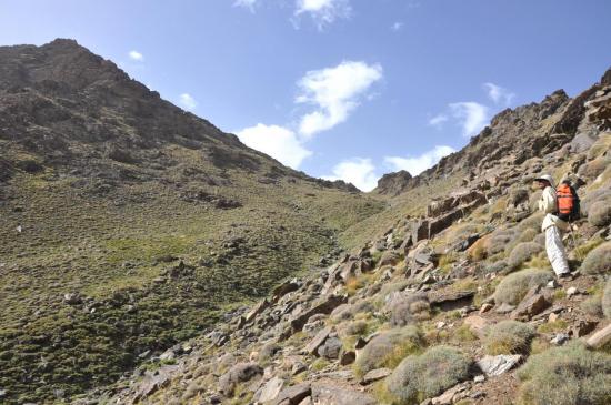 Suivre la piste sur la G en légère descente pour trouver sur la D le départ absolument pas indiqué du sentier de montée au tizi n’Lwez (20mn, 2830m). Celui-ci commence son ascension sur une moraine au milieu des buissons d’épineux avant de s’engager dans un thalweg pentu. Lorsque ce dernier se sépare en deux parties, prendre celui de D dans lequel on commence à retrouver des marques du sentier historique. Lorsque la pente se redresse davantage à l’approche de la crête, incliner vers la D pour rejoindre la selle herbeuse plus agréable à fouler et dans laquelle on peut opérer de large zigzags entre les buissons d’épineux (55mn, 3110m).
