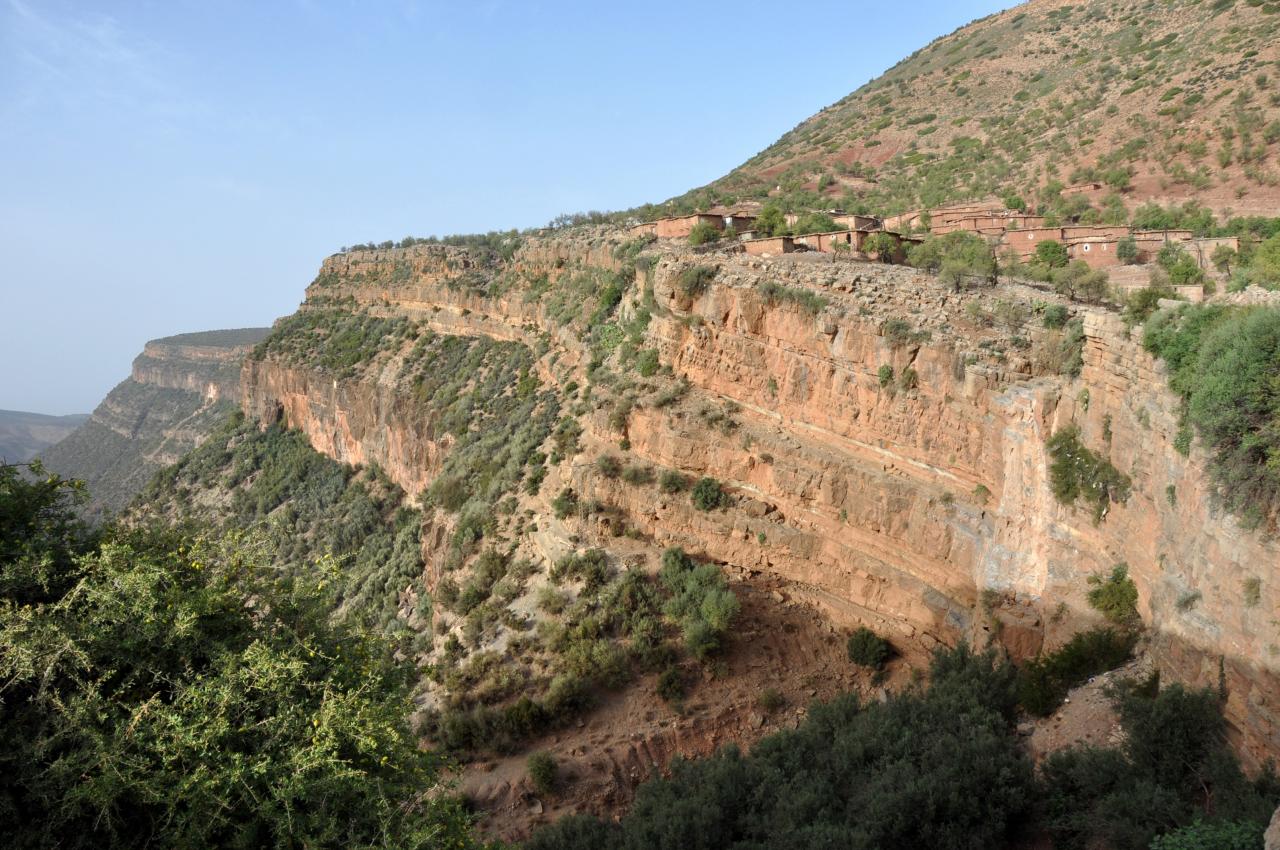 On commence à descendre doucement le long d’une coulée rocheuse jusqu’à entrevoir au loin le fond de la vallée de l’assif n'Ait Moussa : une palmeraie et le grand lac de barrage d’Abdelmoumen qui alimente les villes et villages de la région d’Agadir en eau potable. On incline la marche sur la D au niveau d’une nouvelle coulée rocheuse qui descend de la falaise de l’Isk el Baz (25mn, 1435m). On évolue maintenant en bordure de somptueuses falaises ocre qui dominent un vallon boisé. Un peu sur la droite, une source sourd d’un vallon (10mn, 1375m, 1mn en montant à droite). On passe un petit tertre rouge à la forme caractéristique (10mn, 1405m) et l’on poursuit sur les larges dalles de calcaire qui composent le plateau en haut des falaises. Le sentier incline vers la G pour s’en aller passer le col d’Amguerd Ouram (10mn, 1230m). Belle vue en descendant sur le village agraire d’Aguersouane entouré de nombreux vergers. Au col, prendre à D pour descendre jusqu’au village de Sinit (10mn, 1160m) composé de multiples hameaux dont un, perché sur un monticule, semble fortifié. Continuation par la piste et 300m après avoir dépassé la dernière maison, trouver le départ sur la G d’un sentier à travers champs, sentier qui traverse les terrasses maintenant abandonnées et permet d’atteindre la route goudronnée (20mn, 1005m). A G pour 500m de goudron jusqu’à l’auberge Zolado perchée au-dessus du village de Tazarine Idaoutanane (10mn, 955m). Puis, continuation de la descente sur le goudron pour encore 500m avant de partir tout droit dans un lacet de la route au travers des plantations d’arganiers. On retrouve une piste (15mn, 850m) que l’on suit sur la D. A la boutique, on part légèrement à D pour s’en aller passer auprès d’une maison rouge. On suit le ruban rouge poussiéreux qui conduit vers le fond de la vallée. A la maison au figuier de barbarie, on poursuit tout droit (35mn, 860m, puits). On entre peu après dans le village de Tasguint que l’on traverse jusqu’à la mosquée. Nuit sous tente à quelques mètres au N de la mosquée.