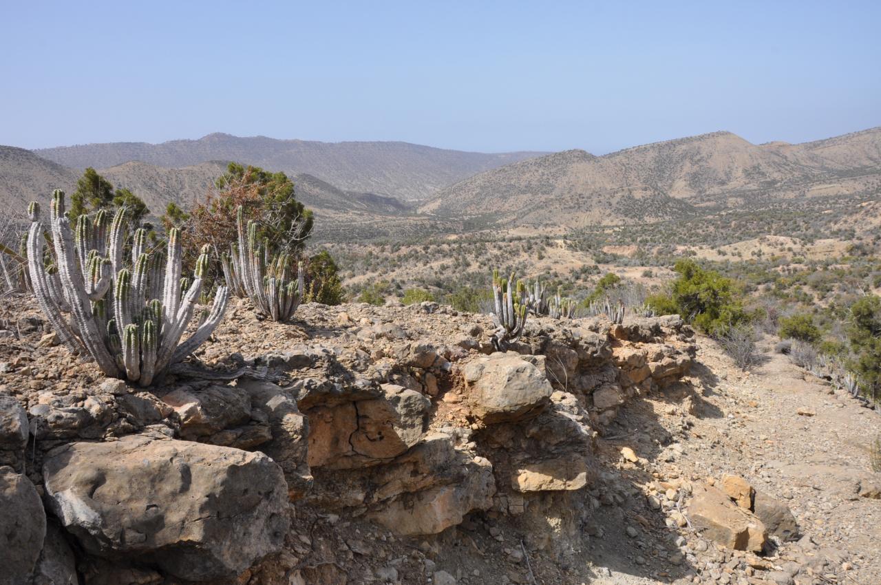 Diaporama Pfouh ! C’est le dernier jour… On suit la piste d’abord vers le N puis tout de suite vers l’W pour monter progressivement jusqu’à un col (35mn, 555m). On descend à peine de l’autre côté que l’on s’attaque au deuxième col sur lequel est construit village de Tizi, le bien nommé (30mn, 625m, maison rose). On poursuit sur le sentier coupe lacet à G puis on revient sur la piste qui infléchit sa course vers la G à l’assaut du dernier « véritable » rempart de cette traversée au long cours. On s’élève en lacets en direction du S jusqu’à rejoindre la piste des crêtes (25mn, 675m). A D pour quelques 300m jusqu’à trouver le départ d’un large chemin sur la G qui aboutit à une citerne désaffectée. Tiens, au fait : c’est bien l’océan Atlantique qui nous présente son horizon rectiligne ! Il était temps quand même… De cette crête de l’Isk Amalou Oughdal, on s’en va trouver dans les fourrés sur la D de la citerne lorsque l’on regarde vers le S le départ d’un chemin bien marqué qui évolue d’abord en courbe de niveau au milieu d’une garrigue rachitique qui tente de survivre dans les interstices des plaques de calcaire avant de plonger en RD d’un thalweg qui se creuse davantage plus on avance vers le fond de la vallée. Le sentier étant au bord de la falaise et ne présentant par moment que quelques dizaines de centimètres de largeur, il convient de n’y engager que des mules expérimentées (mais on commence à en avoir l’habitude…). Sur la droite, on peut apprécier avec un peu de hauteur le sillon creusé par l’Ighzar Oughroud, fleuve côtier à sec dont l’embouchure correspond au mouillage de Tigart.