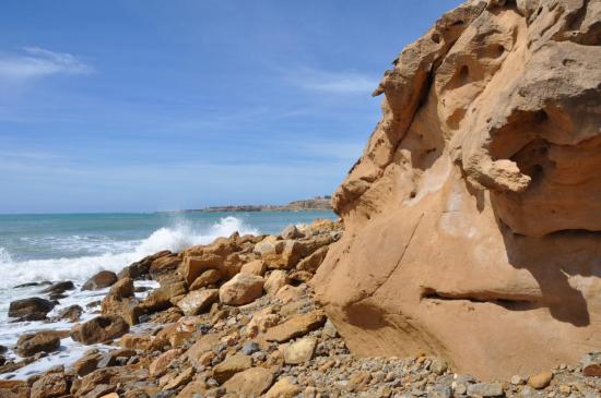 Diaporama On descend par la piste rejoindre le groupe de maisons de pêcheurs puis on s’engage sur le sentier littoral qui part sur la D au-dessus des pierres tombées. Comme le contournement de la pointe rocheuse d’Iysk el Taghzout n’est pas possible, on s’en va prendre pied sur le plateau sableux une trentaine de mètres au-dessus de l’océan. On avance rapidement dans une lande rase au milieu de laquelle quelques champs accueillent de maigres cultures de céréales. On contourne par le haut la crique de Tifardine (40mn, 30m) avant de longer les falaises d’Ifri Wouli. On poursuit à mi-hauteur à travers la lande alors que quelques petites dunes de sable commencent à apparaître. On finit par descendre au bord de l’eau juste avant la pointe de Talakchout (40mn, 5m) mais comme celle-ci ne présente pas de possibilité de contournement par sa base, nous voici donc à remonter sur la falaise pour un bref moment jusqu’aux maisons de pêcheurs de Id Balqasem (15mn, 10m). On remonte en biseau sur la D pour retrouver le chemin sur la falaise.