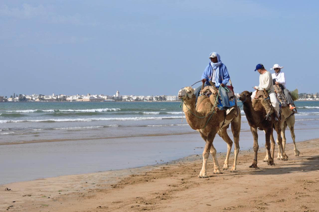 Après, rien de difficile c’est direction NNE sur la plage jusqu’à Essaouira… A noter deux choses quand même : d’abord une source qui coule à 10m de l’océan à proximité des cahutes de pêcheurs (20mn) puis, surprise de taille, la nécessité de se mouiller les pieds, les jambes (et la ceinture pour les petits…) au moment de traverser l’oued qui « défend » l’entrée de la plage d’Essaouira (1h30, parfois des chameaux peuvent aider au franchissement du bras moyennant 20Dh). Après la surprise… on suit la plage jusqu’au pied de la médina d’Essaouira, terme de la randonnée. Nuit dans l’une des chambres à louer dans les quartiers hors murs pour une visite le lendemain matin de la cité portuaire (tous commerces, banques, ATM, restaurants de poissons sur le port ou autres spécialités dans la ville close, T, C, E).