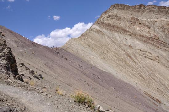 On sort du monastère par la gauche au niveau du parking des voitures. On descend la piste jusqu’au virage vers la droite pour s’engager dans le thalweg qui s’ouvre au N. Diaporama Un peu plus avant dans la gorge, on suit un bon sentier cairné qui s’engage dans le thalweg de G. Puis on quitte le lit de la rivière à sec pour monter en lacets à G sur la crête d’une moraine détritique bien relevée au milieu d’une large vallée. Le paysage est splendide pour peu que l’on soit féru de plissements géologiques et de succession de strates colorées. Côté végétation, nenni ! On atteint un petit plat (1h30, 3850m) et on s’engage sur une traversée à flanc en direction du col que l’on devine caché derrière une épaule rocheuse. Dernier petit effort pour prendre pied sur la crête du Kui La (ou Khungi La, 20mn, 3950m).