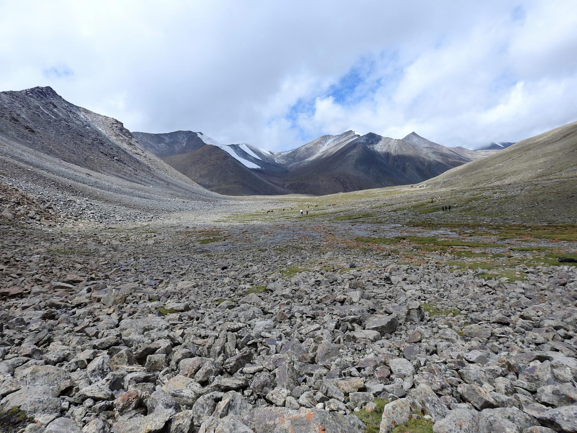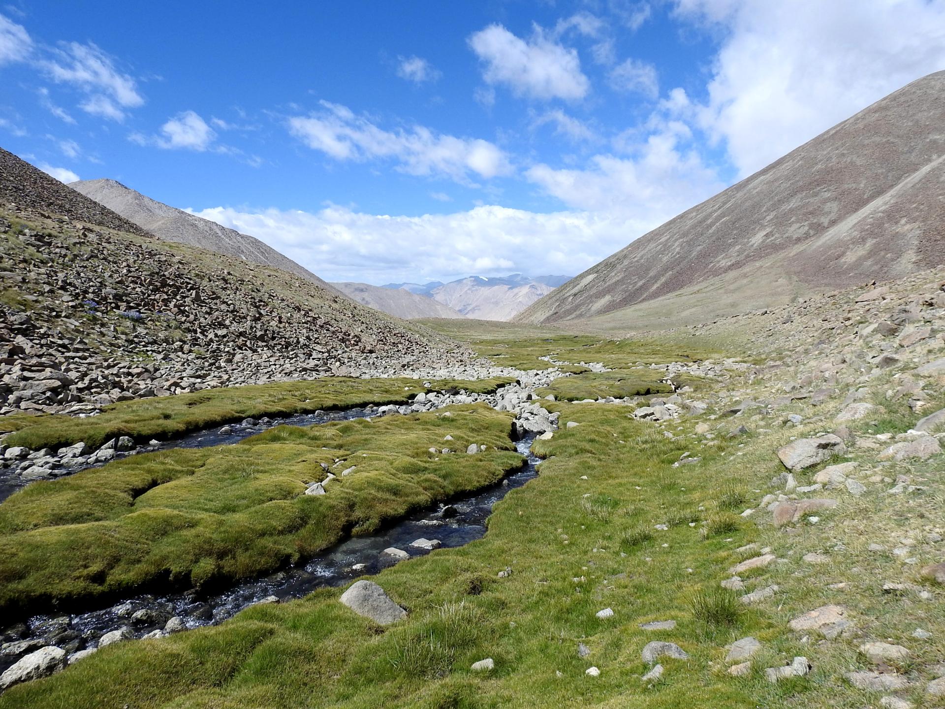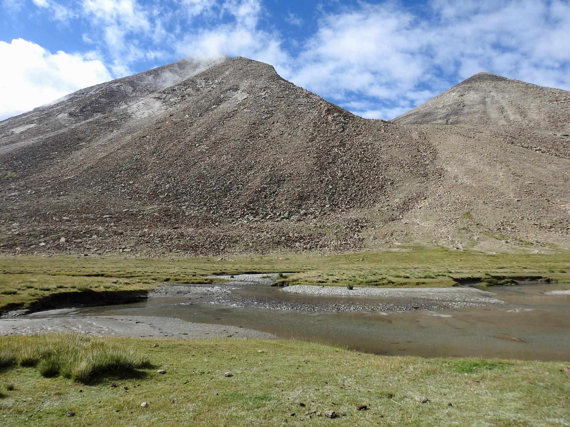 On traverse la rivière pour en suivre la RD avec une alternance de banquettes herbeuses et de cailloux. La vallée plonge d'un coup pour se mêler à la vallée principale de la Lalung Togpo en direction de l'E vers Khera Pullu. On reste en RD sur une alternance de tourbières humides et d'éboulis. On dépasse plusieurs vallons émissaires qui arrivent de gauche comme de droite et on établit le campement sur un large plateau gazonné à proximité d'un lac un peu avant une double confluence de vallées (1h10, 5175m, eau dans la rivière, GPS : 33°44'15"N 78°14'01"E).