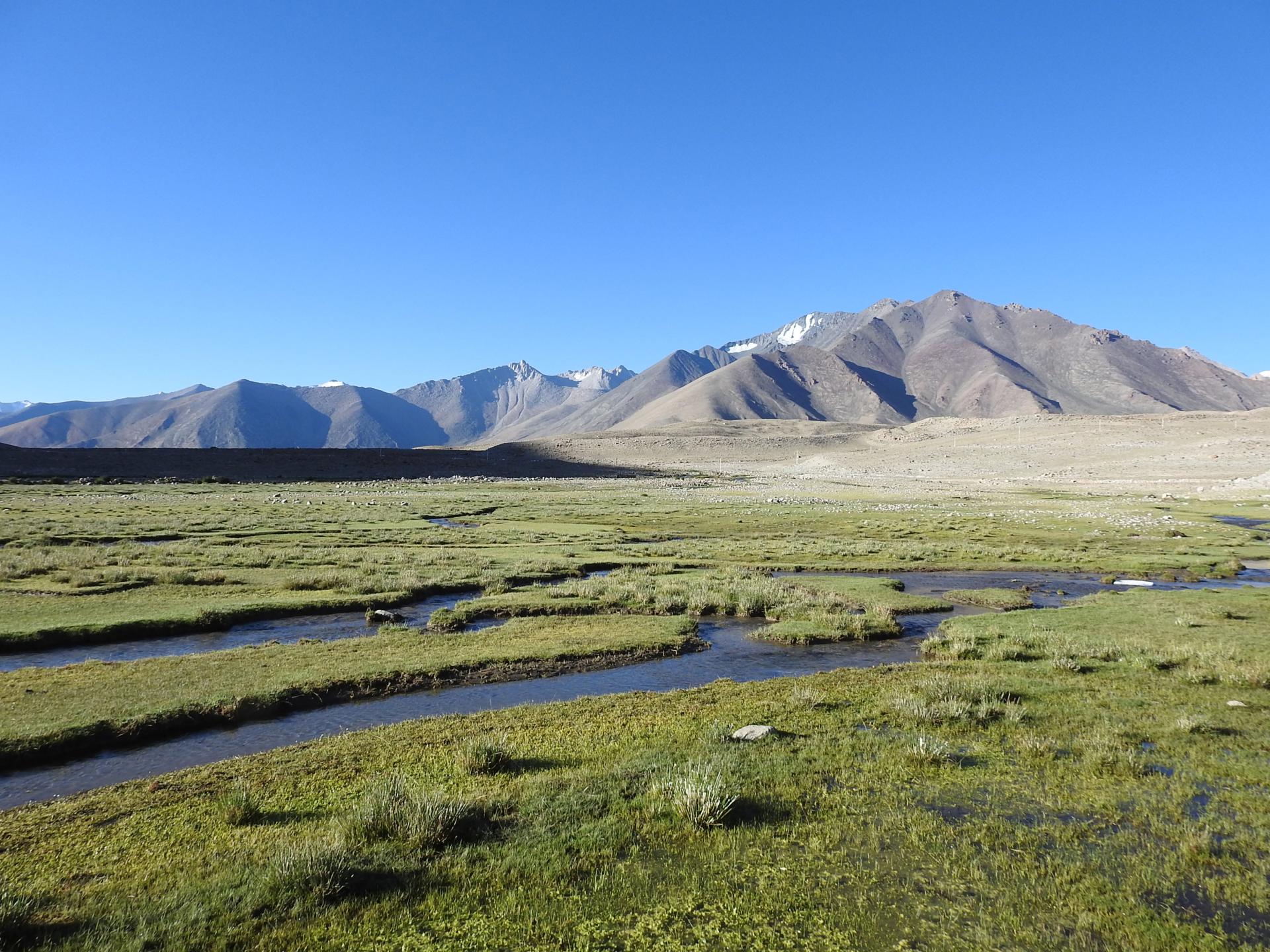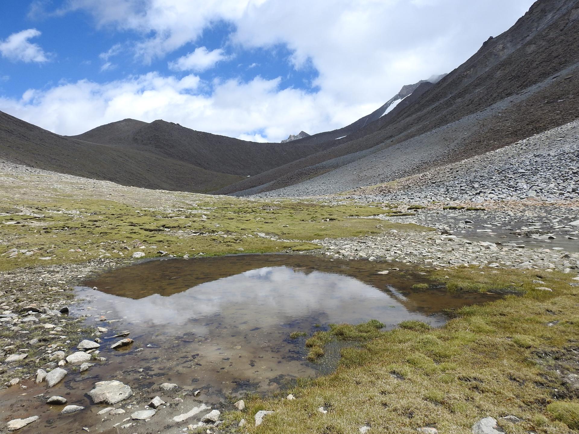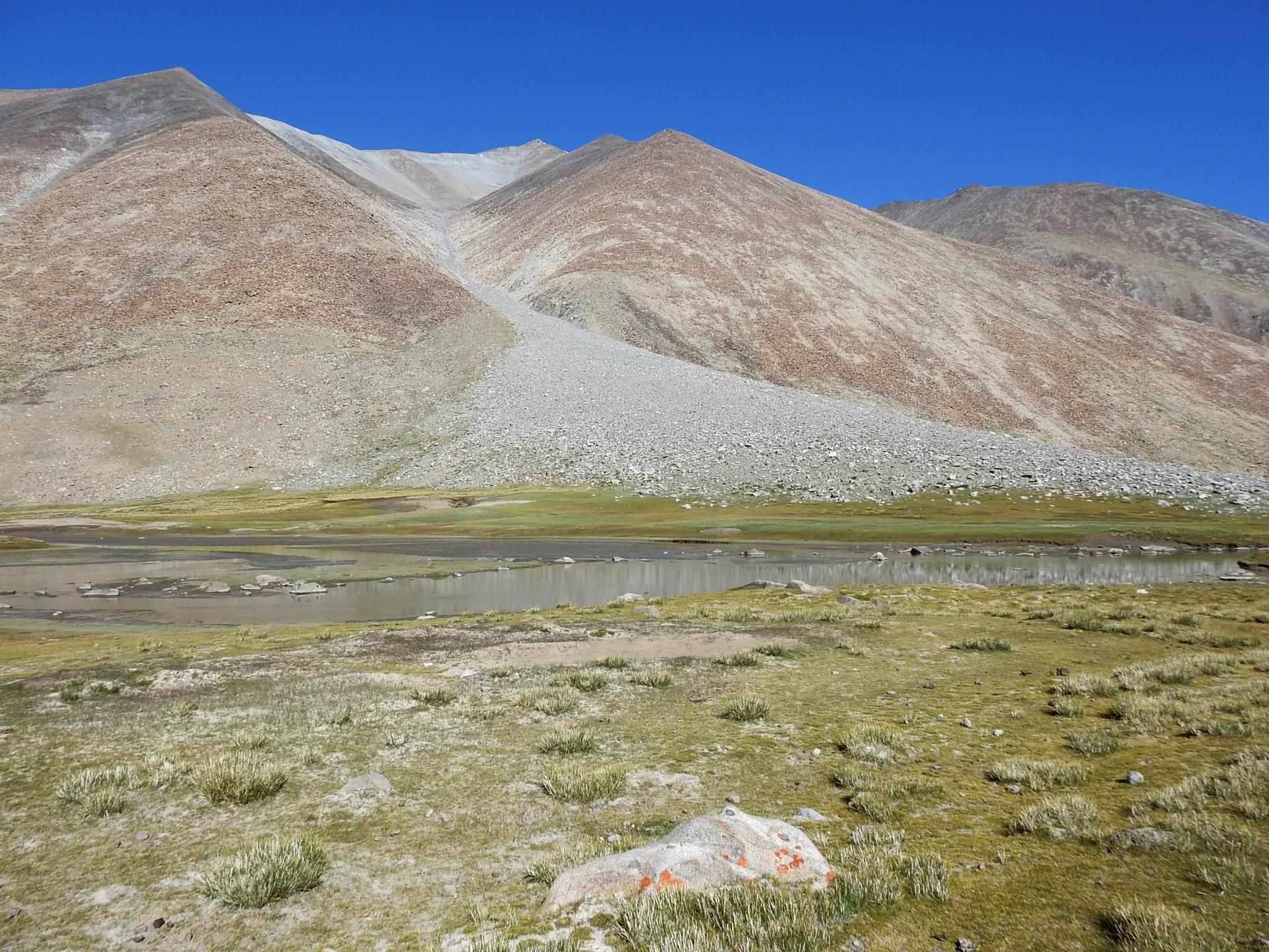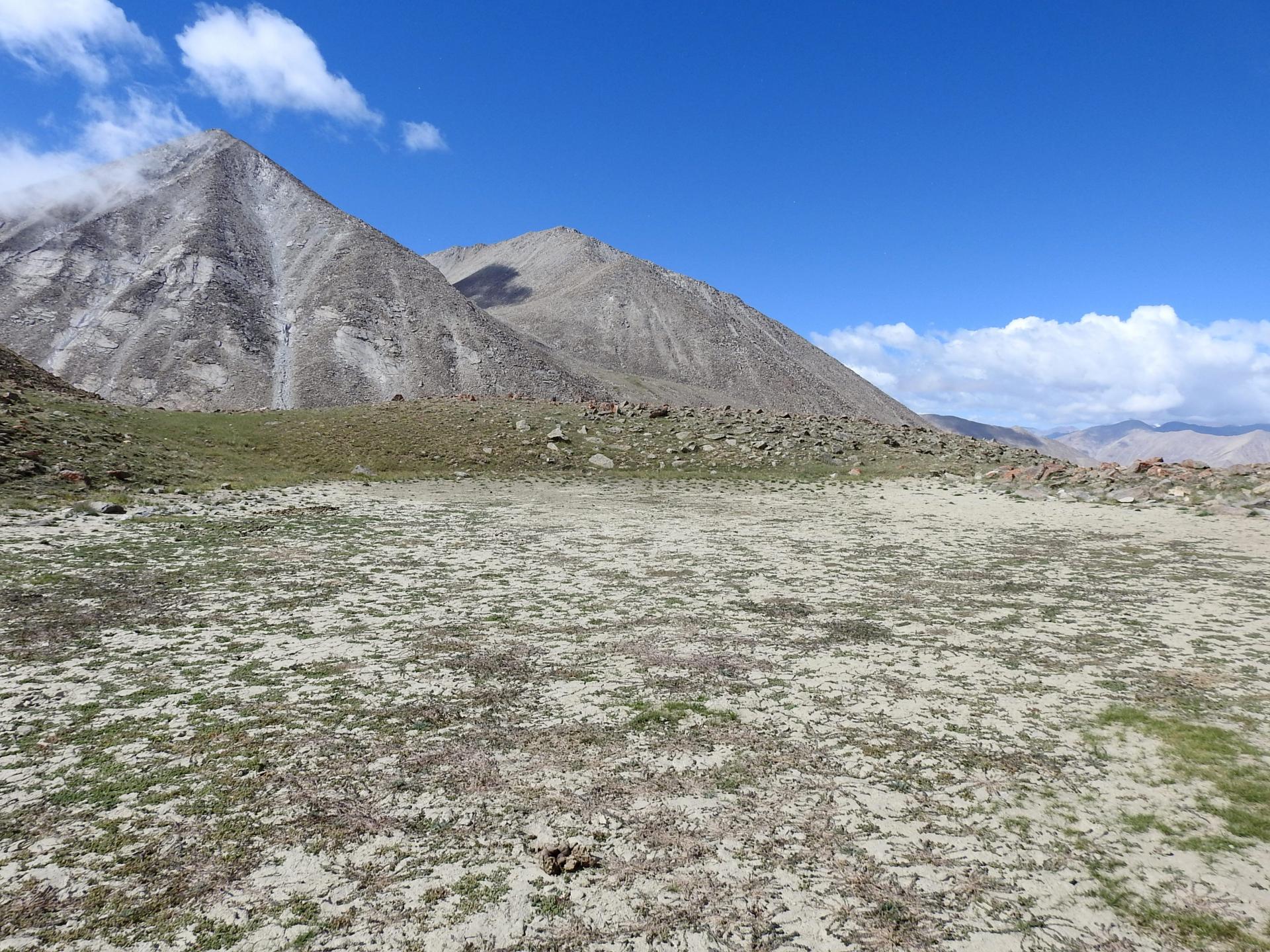 On traverse la rivière pour en suivre la RD avec une alternance de banquettes herbeuses et de cailloux. La vallée plonge d'un coup pour se mêler à la vallée principale de la Lalung Togpo en direction de l'E vers Khera Pullu. On reste en RD sur une alternance de tourbières humides et d'éboulis. On dépasse plusieurs vallons émissaires qui arrivent de gauche comme de droite et on établit le campement sur un large plateau gazonné à proximité d'un lac un peu avant une double confluence de vallées (1h10, 5175m, eau dans la rivière, GPS : 33°44'15"N 78°14'01"E).