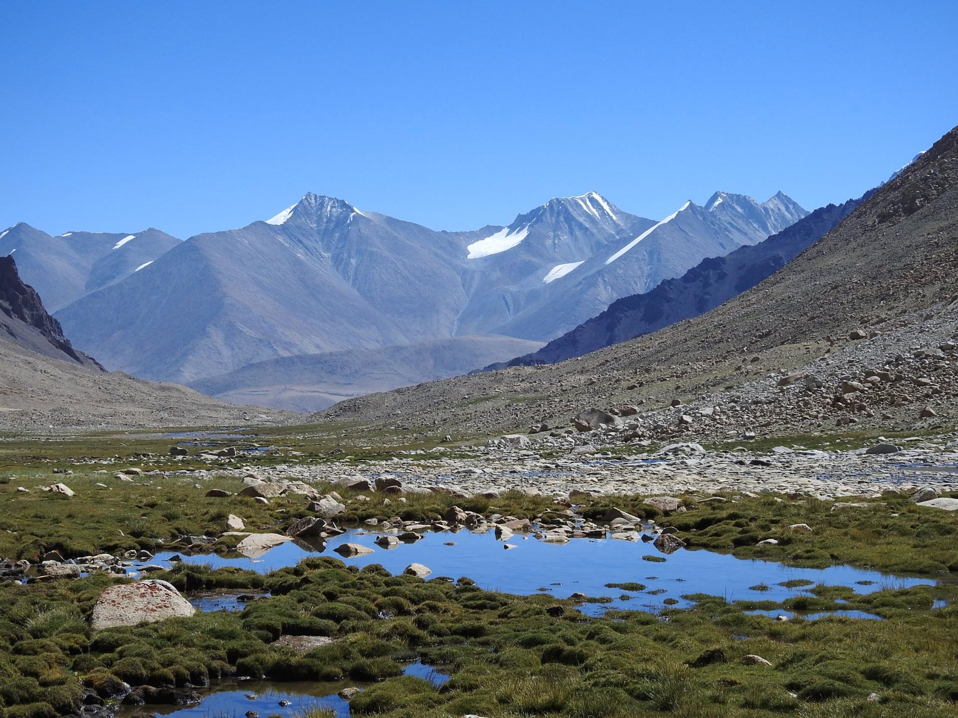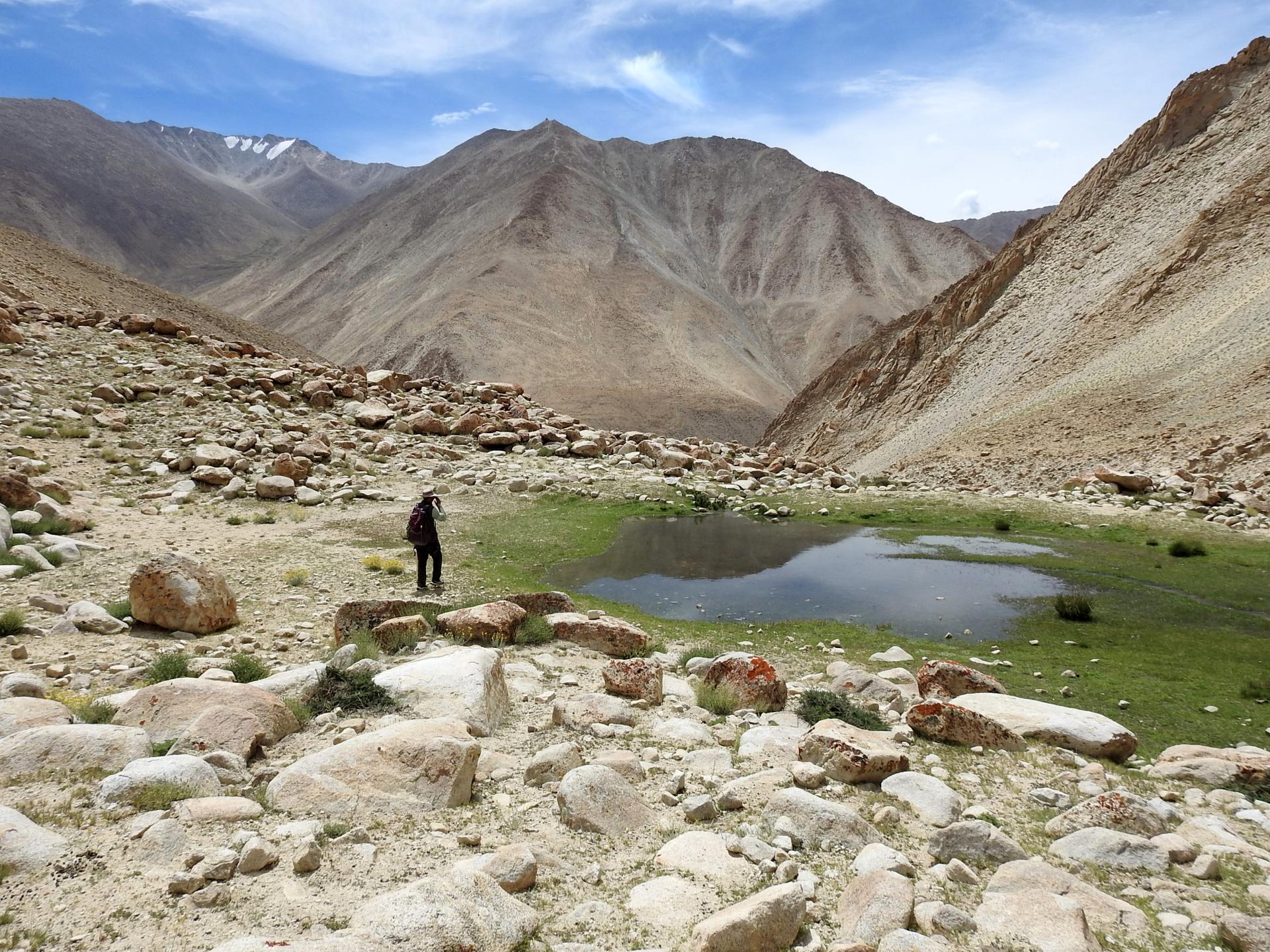 Au départ du bivouac, on laisse derrière soi la superbe vue des glaciers de la Ladakh range pour se concentrer sur les montagnes qui vont nous régaler tout au long de la descente. On commence par contourner le lac par sa RD avant d'initialiser la descente en restant, du moins au début, en RD de la vallée. Là encore, on va de nouveau être confronté à la traversée de tourbières sur lesquelles il va falloir, comme à l'habitude, faire attention à ne pas mettre un pied dans les trous d'eau...