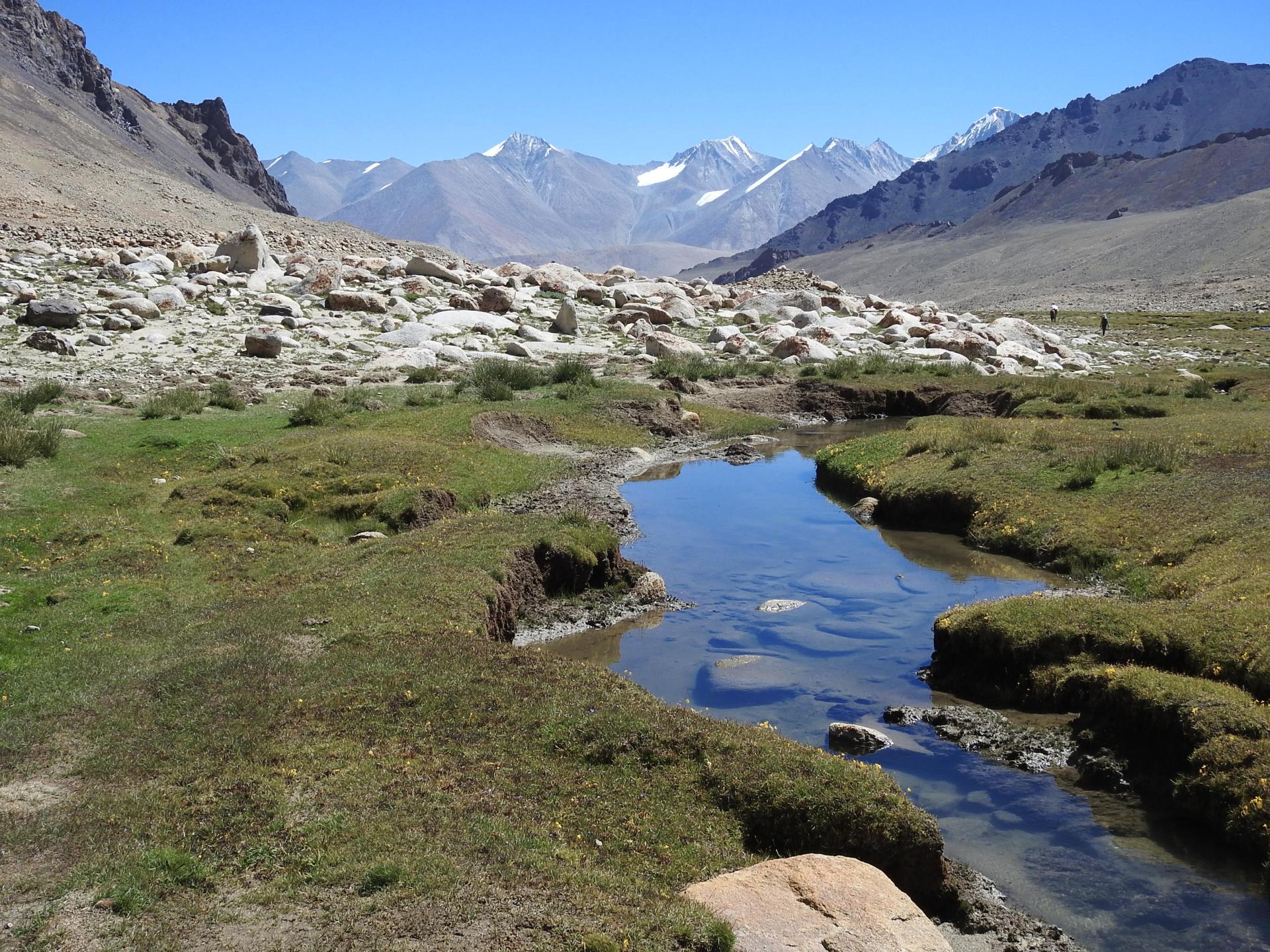 Vers 4960m, on traverse en biais la rivière qui s'est étalée sur la totalité de la plaine en utilisant les nombreux blocs de pierre sous laquelle l'eau s'écoule. On se retrouve en RG de la vallée où l'on doit remonter une zone humide, un parcours où il faut porter une attention particulière pour ne pas se fouler une cheville dans le cas où l'on raterait le pas sur le sommet d'une motte d'herbe... On atteint la dernière doksa de la vallée, celle d'Argue (50mn, 4915m).