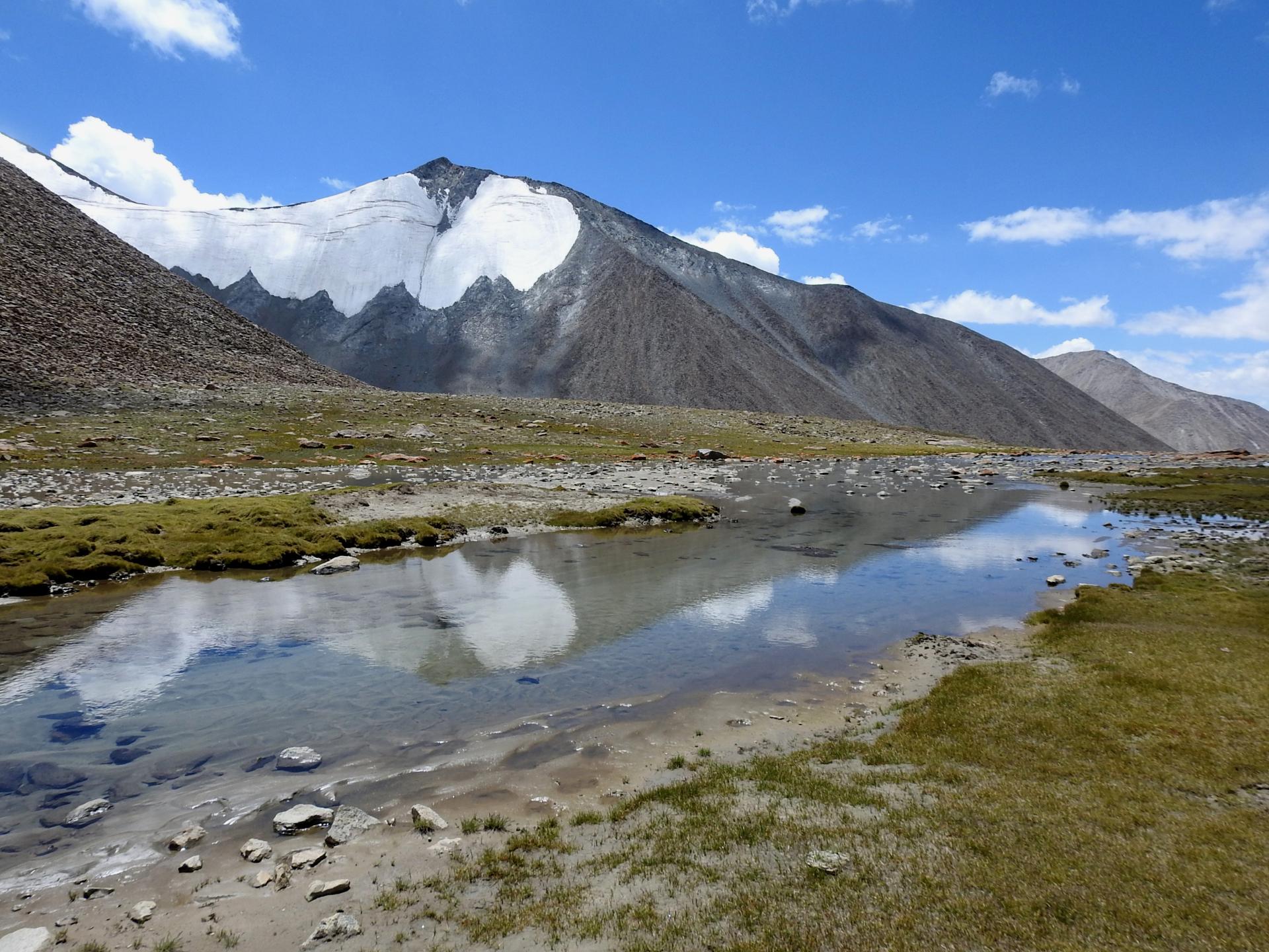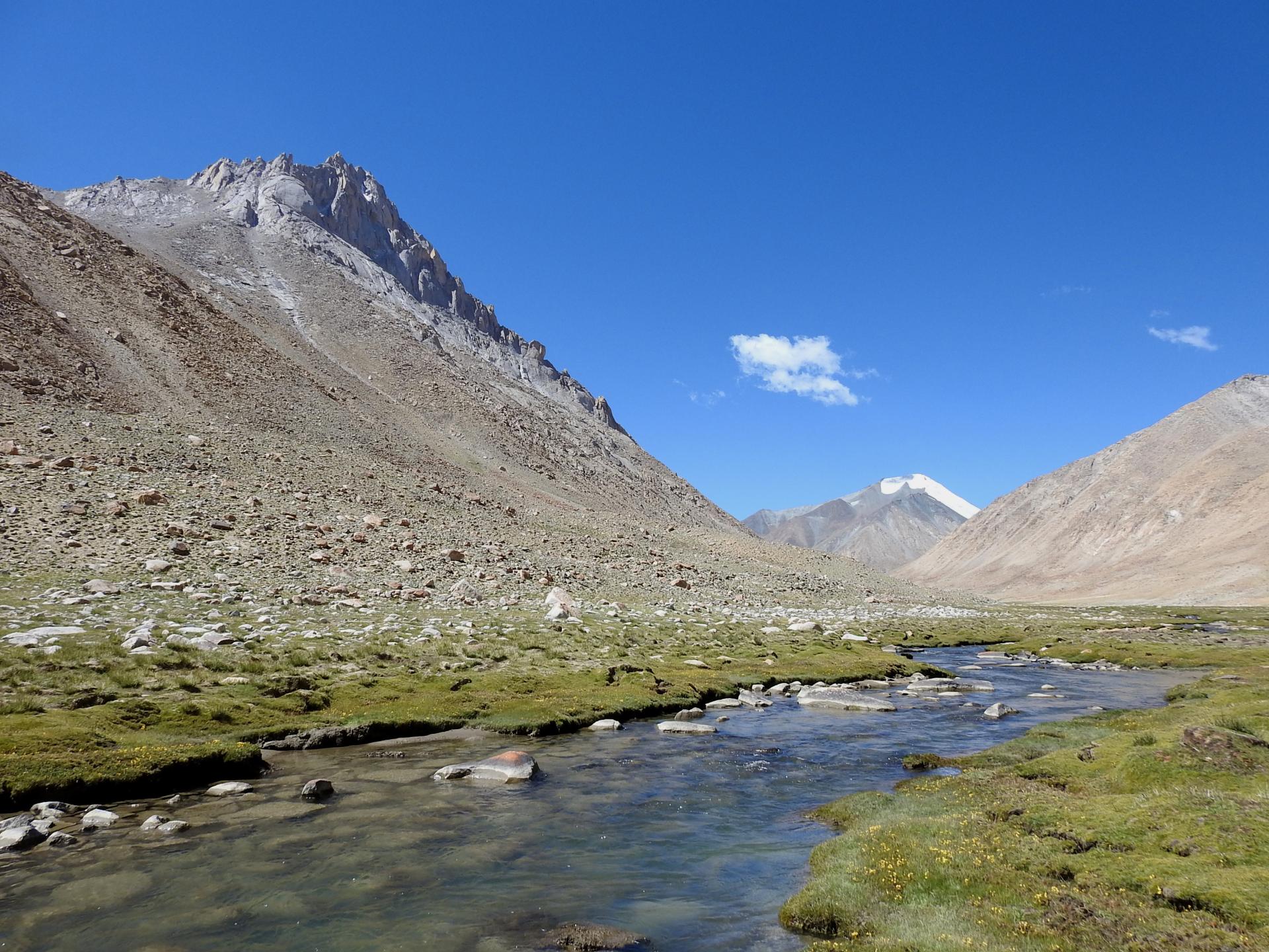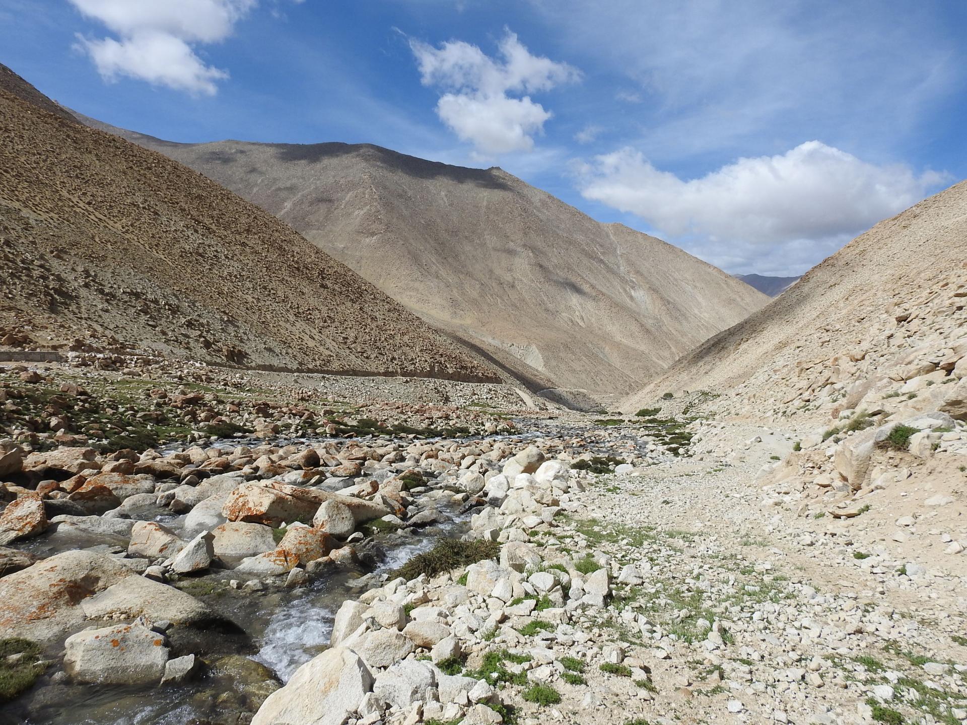 On remonte la moraine RD jusqu'à la doksa située à la confluence à 4875m pour suivre la RD du torrent qui arrive de la G du Tundup La (voir topo Changthang depuis Ligche pour le baptême de ce col sans nom...) pour tomber sur une passerelle providentielle qui évite de le traverser à gué. On poursuit sur le fil de la moraine centrale au-dessus de la confluence pour rejoindre la RD de la vallée orientée WSW et dominée à main droite par les sommets détritiques du Ruhru. On évolue en up / down tout en louvoyant entre les rochers de granit pour atteindre une prairie (40mn, 4915m) d'où l'on descend à flanc de moraine rejoindre les banquettes herbeuses présentes sur la RD de la rivière. On reste à hauteur de la rivière pour éviter une moraine en la contournant par un petit sentier tracé à sa base et découvrir à la sortie une plaine humide.