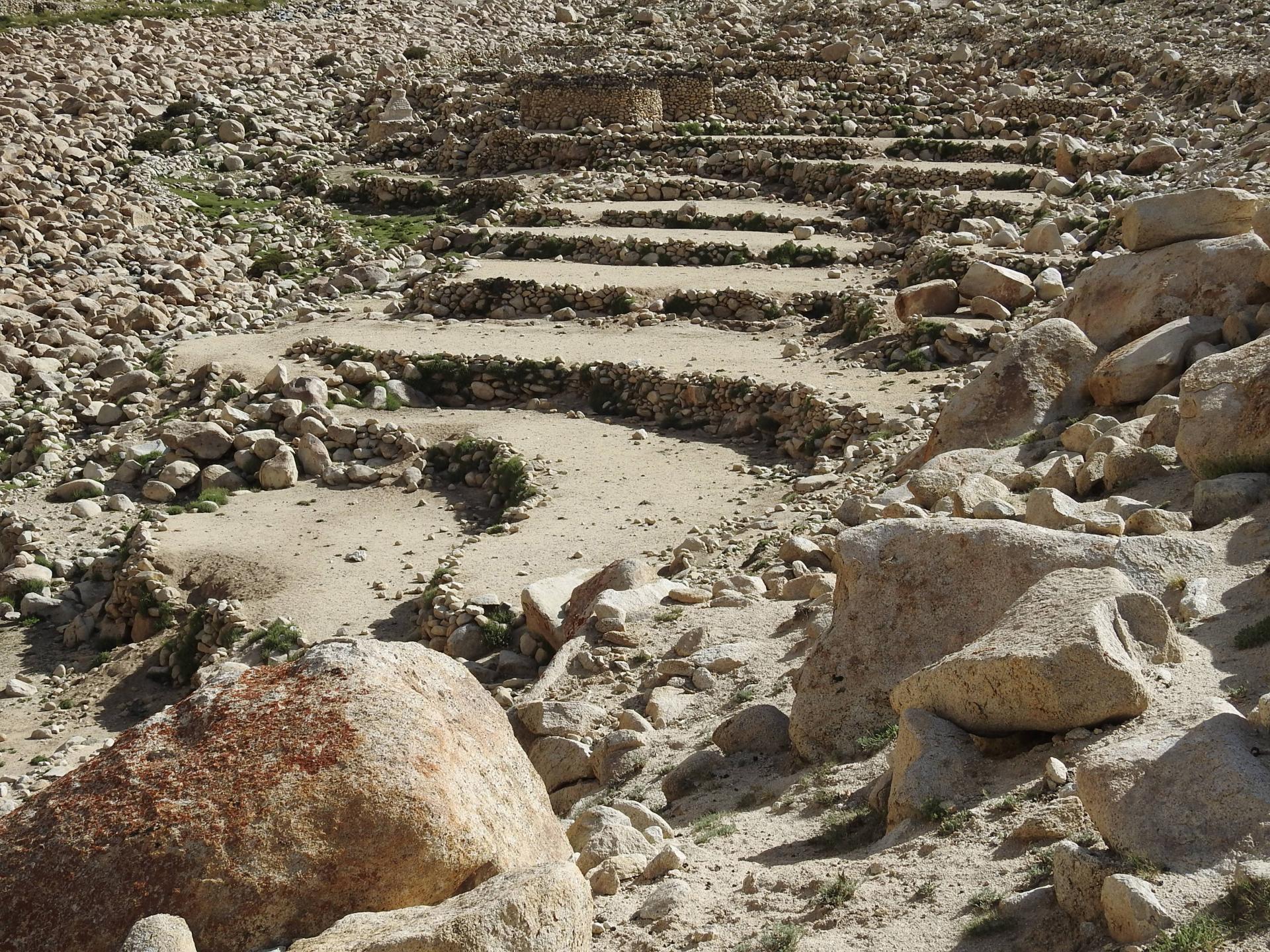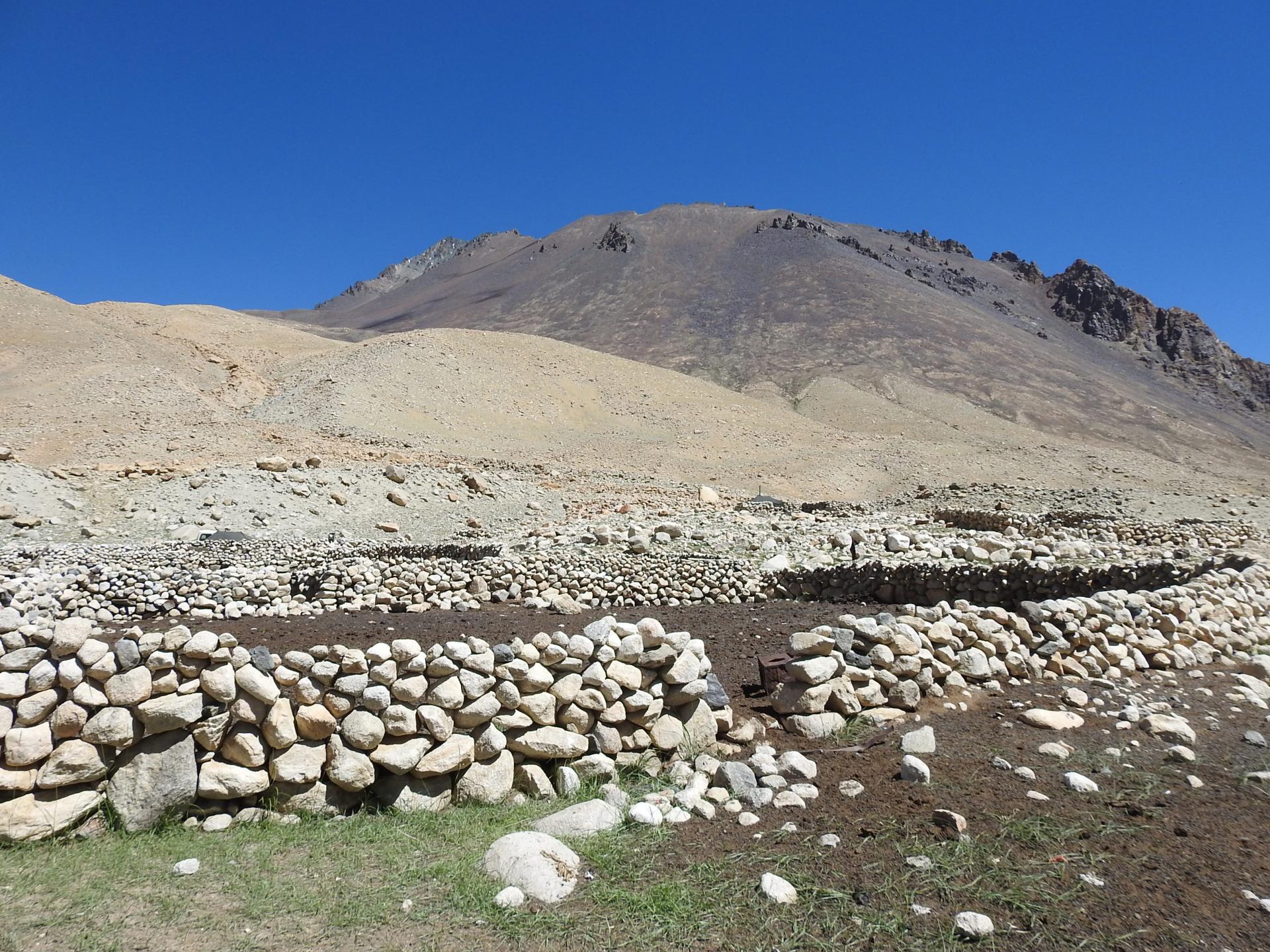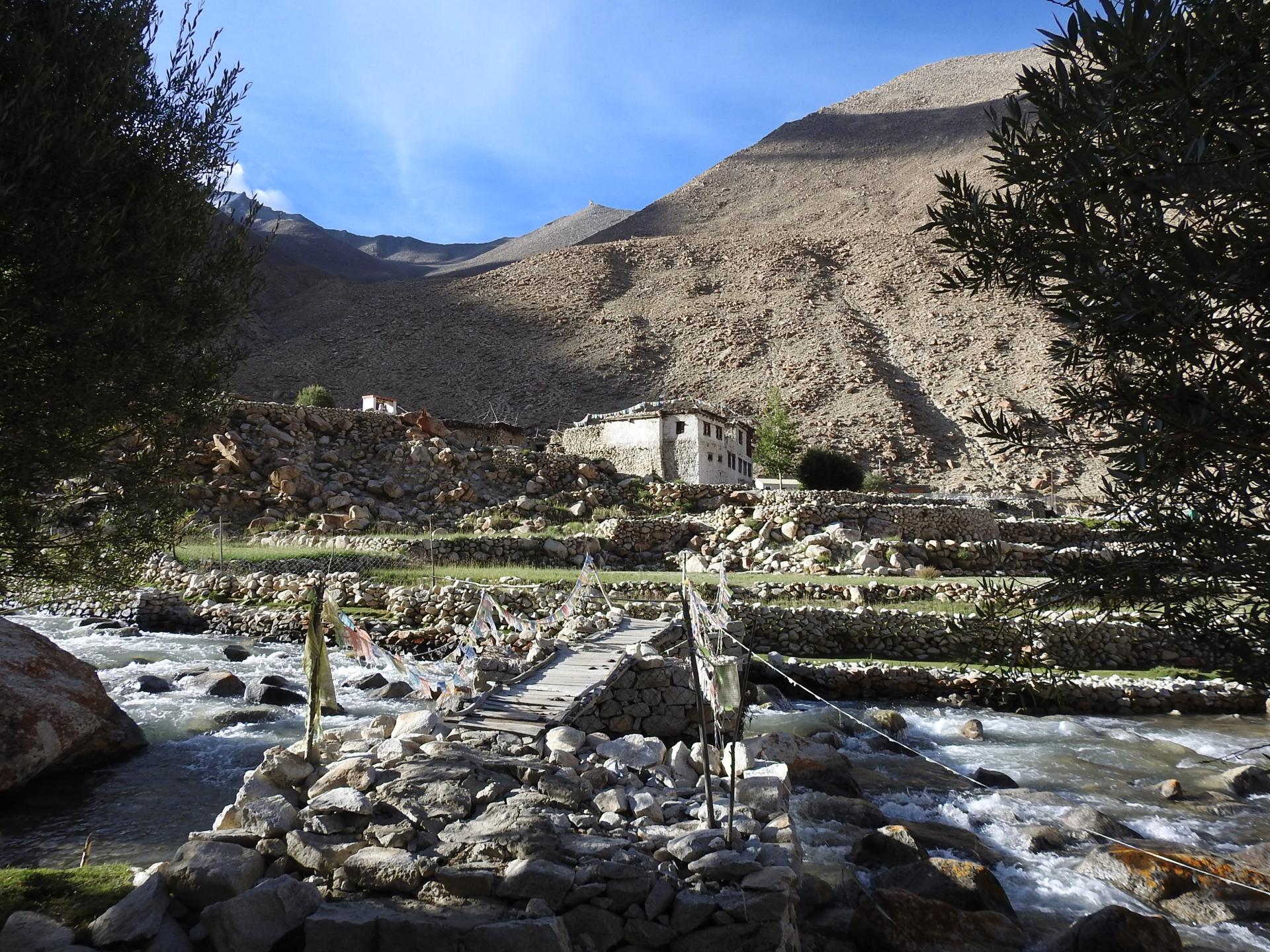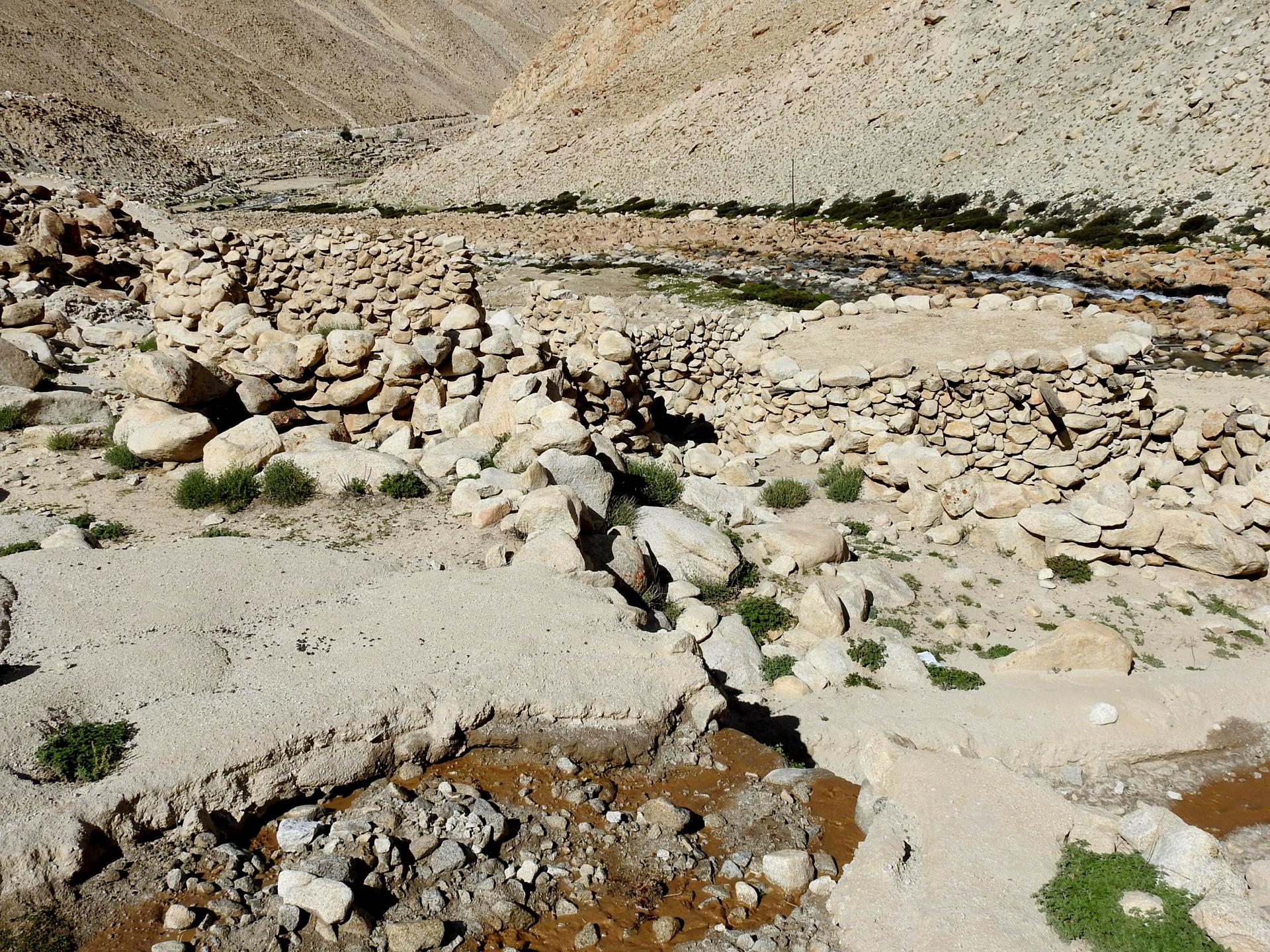 Du bivouac, on remonte la vallée de la Kyungyam Togpo (ou Phuchheya Togpo sur certaines cartes...) sur la RG en empruntant le sentier historique qui lui-même suit le canal d'irrigation. On croise une piste d'accès au dernier groupe de maisons électrifié de la vallée et on poursuit au-dessus en traversant un véritable village entouré de cultures en terrasse aujourd'hui abandonné. Quel passé agricole peut-on encore lire dans ces vestiges ? Aujourd'hui, c'est fini : des maisons, il ne reste que les ruines (en galets roulés...), les terrasses arides présentent un aspect de désolation...