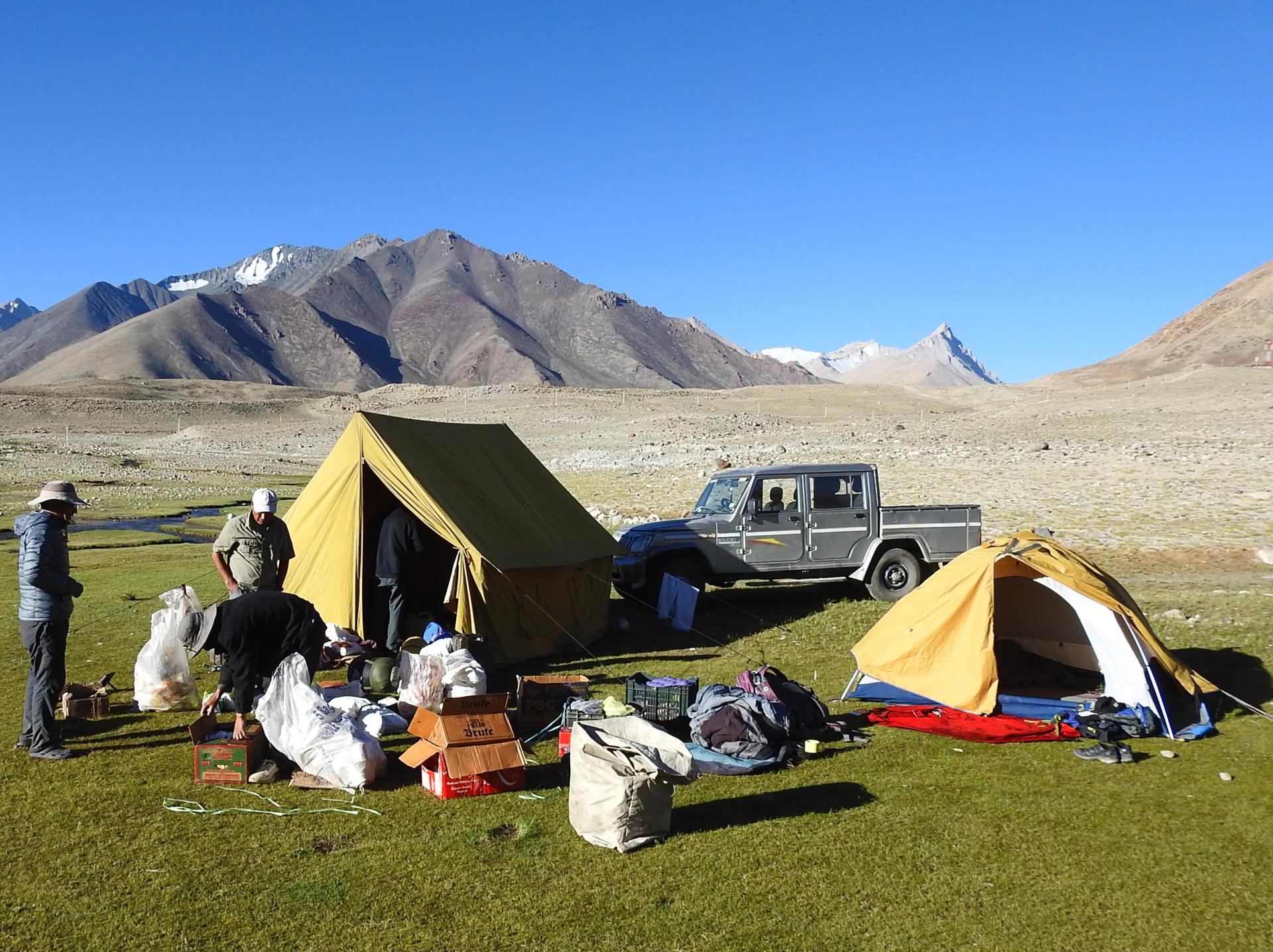 Puis on croise une source abondante qui sourd d'une moraine en RD (15mn, 5285m). La descente se poursuit sur un bon sentier qui traverse une série d'alpages à yacks jusqu'à atteindre le lieu de bivouac : une doksa située un peu avant la confluence avec une vallée fluviale qui arrive du cirque glaciaire du Tamki, un beau "bébé" de presque 6000m, à 3m près (25mn, 5065m, eau de source en RG de la rivière, GPS : 33°48'32"N 78°03'14"E).
