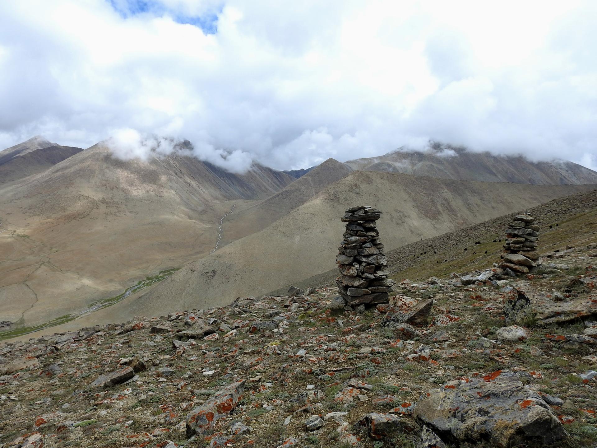 Du camp on remonte à flanc la moraine caillouteuse en direction du S puis en haut on incline sur la D pour rejoindre un premier lhato qui coiffe un petit monticule (20mn, 4815m) d'où on dispose d'une vue plongeante sur la doksa. On traverse le plateau herbeux au SW pour dépasser un enclos à bestiaux vers 4845m et trouver au-dessus un sentier transversal que l'on suit sur la D pour rejoindre la crête qui se présente avant de basculer dans le vallon de l'Ichu Togpo (25mn, 4905m).