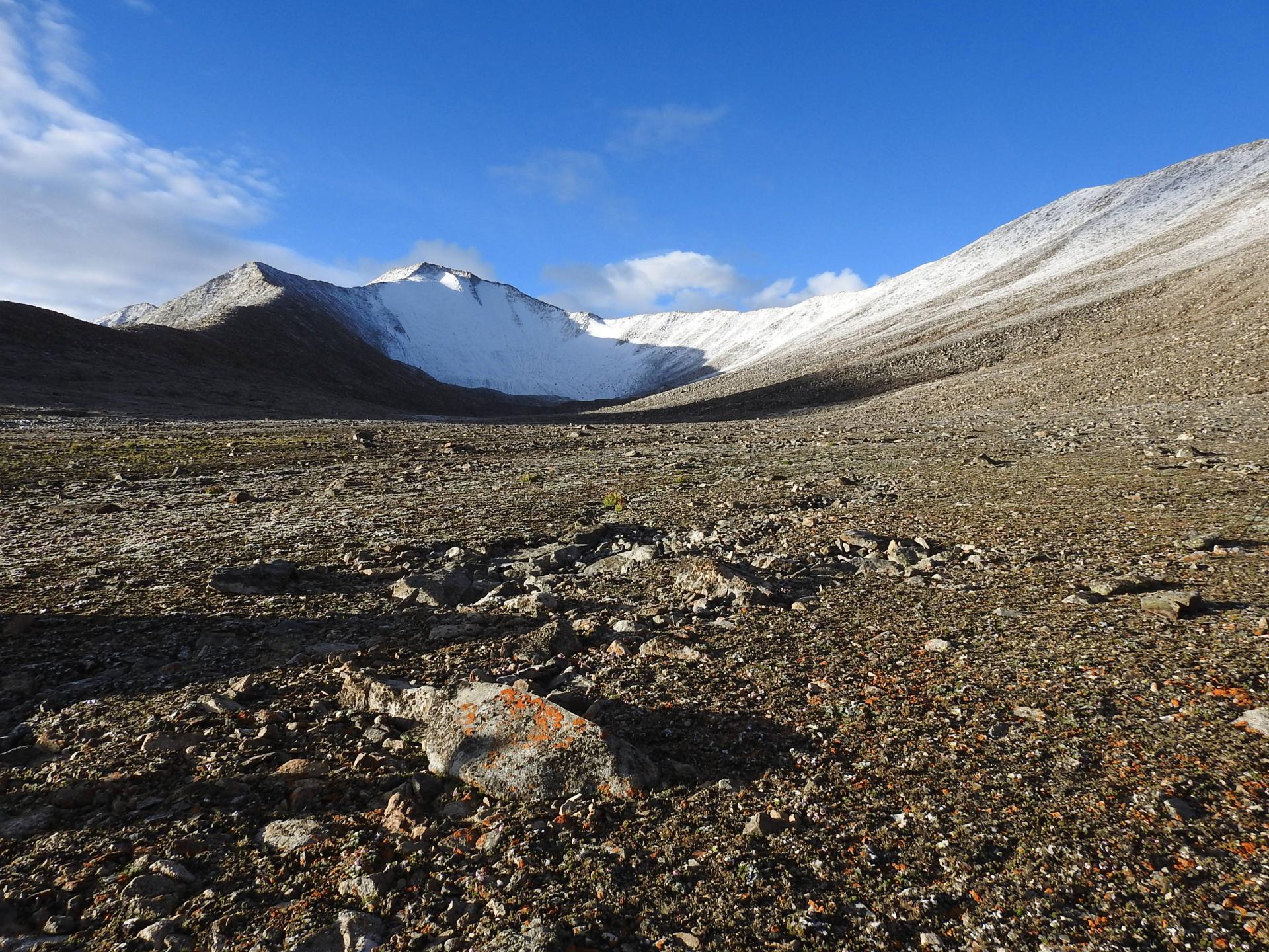 De puis le lieu de bivouac, on descend sur les moraines herbeuses en RD de la vallée face aux montagnes du N du Rupshu : de gauche à droite, Pologonka, Guide Ri, Thagmar, Thugje et Chokr pratiquement tous des 6000 peu connus car situés dans une partie de cette région peu parcourue puisque l'itinéraire entre les lacs Tsokar et Tsomo Riri passe plus au S...