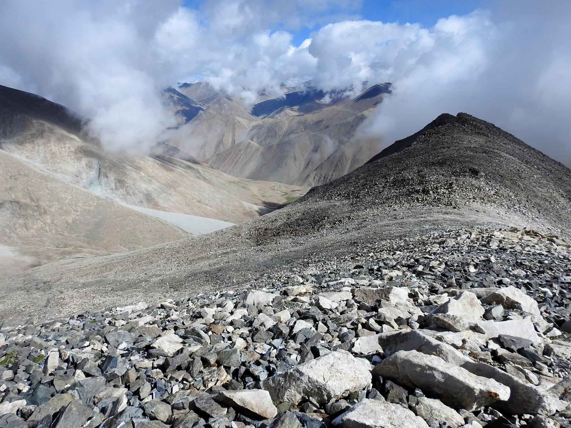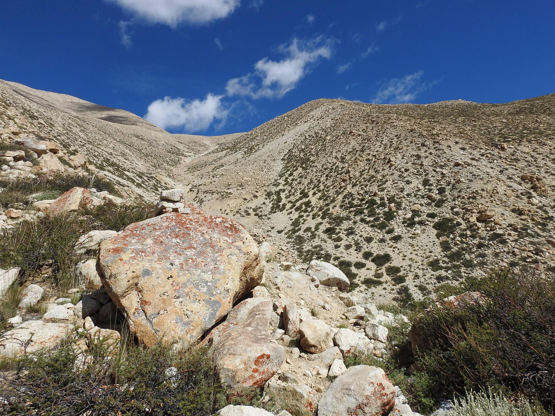 Au-delà, on poursuit la marche vers l'WSW en remontant une moraine derrière laquelle on dépasse des enclos à bestiaux. Ça y est ! On est dans la dernière partie de cette vallée de la Bulchung Togpo, assez interminable. La remontée alterne espaces caillouteux et herbacés. Mais ces derniers sont la plupart du temps des tourbières au profil irrégulier et la marche y est particulièrement difficile sans parler qu'il est impossible de trouver le rythme adéquat pour ne pas être essoufflé, on est à 5000m quand même ! On croise un impressionnant cône de déjection qui descend de l'arrière du cirque du Ruhru avant de retrouver une prairie-tourbière. A l'horizon, ce sont les pentes austères minérales rouges du Yogma La qui se découvrent.