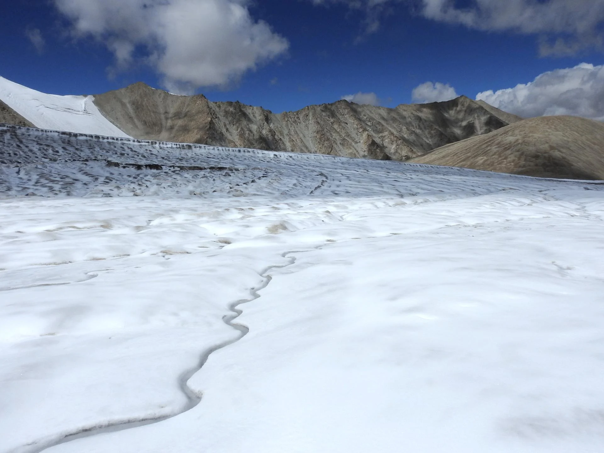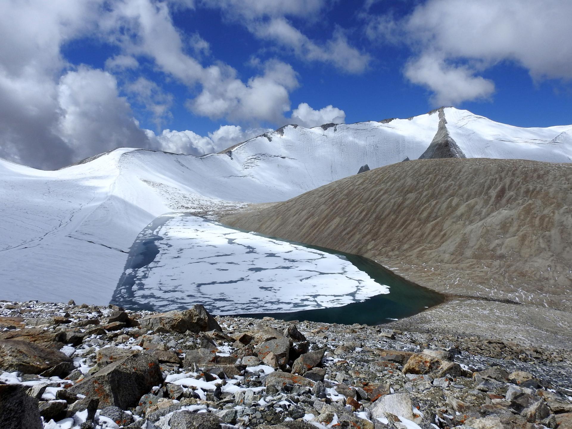 Tout au fond, on distingue la sortie de ce cirque par le haut avec le large passage du Steansi La, on compte pas moins de 4 glaciers dont un, ce qui est assez rare au Changthang, fleuve, qui présente une langue plutôt allongée qui descend jusque dans la vallée. Mais le clou de la journée, c'est la présence d'un lac glaciaire qui s'est peu à peu formé avec la fonte du glacier et qui occupe la partie centrale du paysage. Étonnantes aussi ces bédières qui veinent le glacier RD et qui se sont réunies en une seule pour percer un tunnel dans le repli de glace qui protège le lac afin d'écouler ses eaux de fonte. Un paysage exceptionnel !