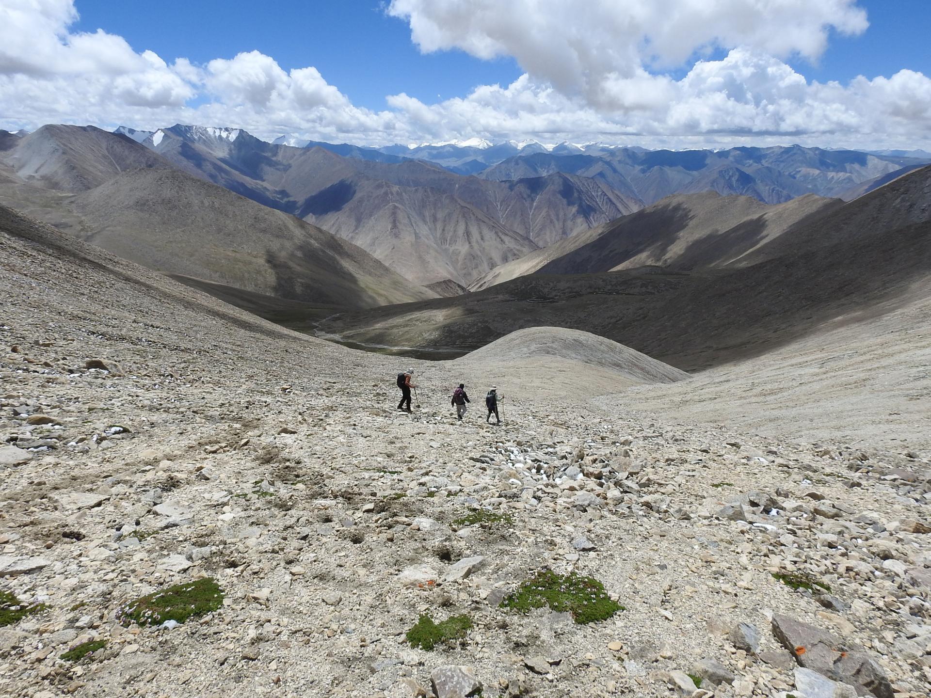 La descente ne s'effectue pas sur un sentier bien tracé. Il faut dire qu'avec le peu de bipèdes qui emprunte cet itinéraire, cela paraît normal. Par contre, ce passage est très utilisé par les colonies de bharals et les yacks pour passer d'une vallée à l'autre, la présence d'excréments et de cornes en attestent. On descend en se servant de quelques banquettes terreuses qui se trouvent entre les éboulis avant de commencer à trouver, au mitan de la descente, l'opportunité de fouler des banquettes herbeuses le long de petits ruisseaux qui dévalent la pente. Alors que l'on va bientôt rejoindre la rivière qui arrive de la droite, on incline sur la G pour rester à hauteur sur la moraine herbeuse et rejoindre un emplacement de bivouac à la confluence avec un vallon qui descend du pied du sommet du Nlashigo au lieu-dit Steansi Brok (55mn, 5210m, GPS : 33°41'26"N 78°06'12"E).