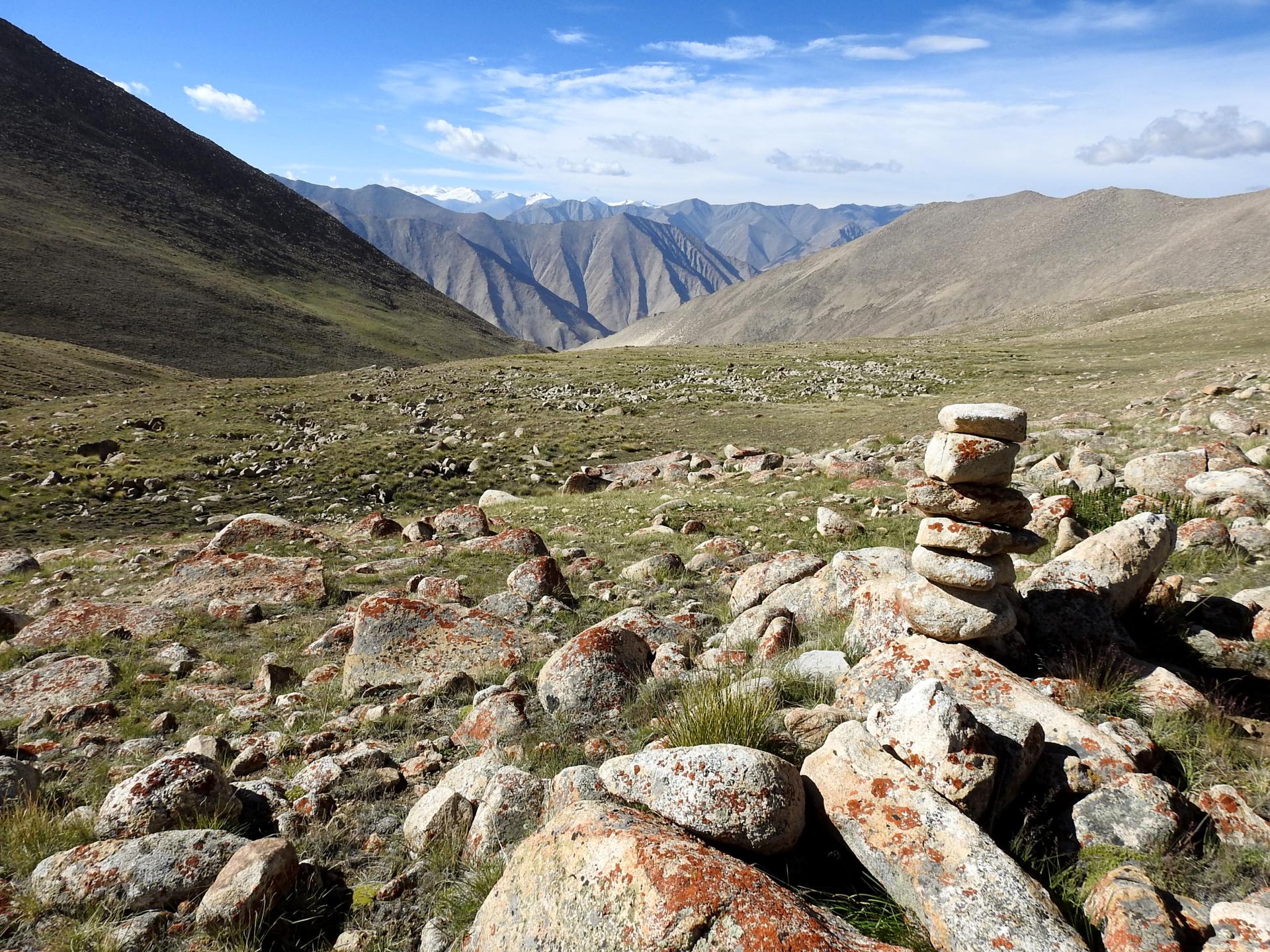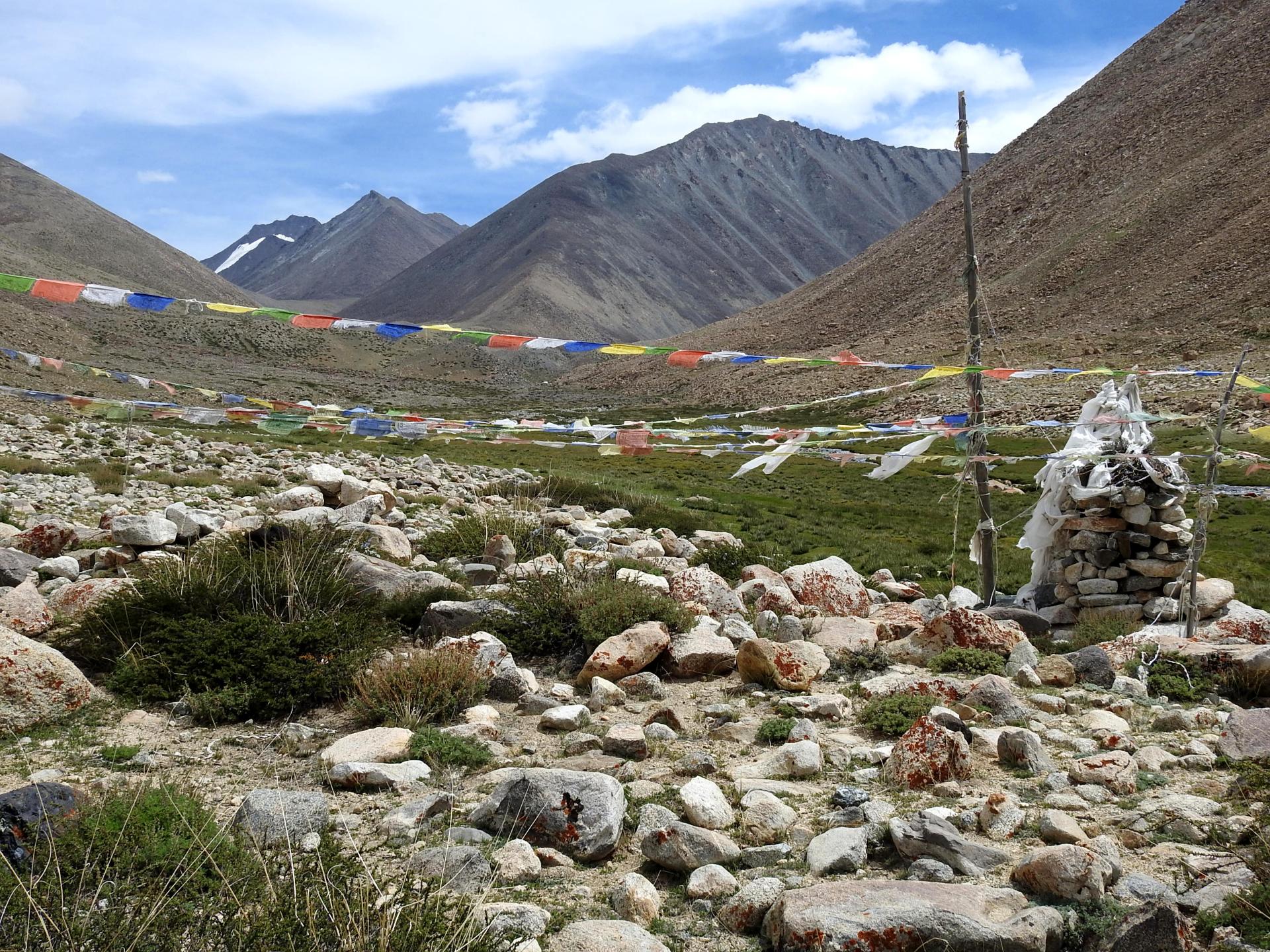 On dépasse la confluence avec un vallon qui descend de la gauche ayant pour origine le Gongma La (voir le topo dans la rubrique des Explorations en cours Le Changthang depuis Ligche). On ne peut pas dire que la descente soit ardue, moins de 100m de dénivelée négative en 1 heure de temps ! On commence à voir à l'horizon quelques pics de la Pangong range. On dépasse une doksa puis un peu plus bas un lhato à proximité duquel flotte au vent un darchok (1h, 5050m).