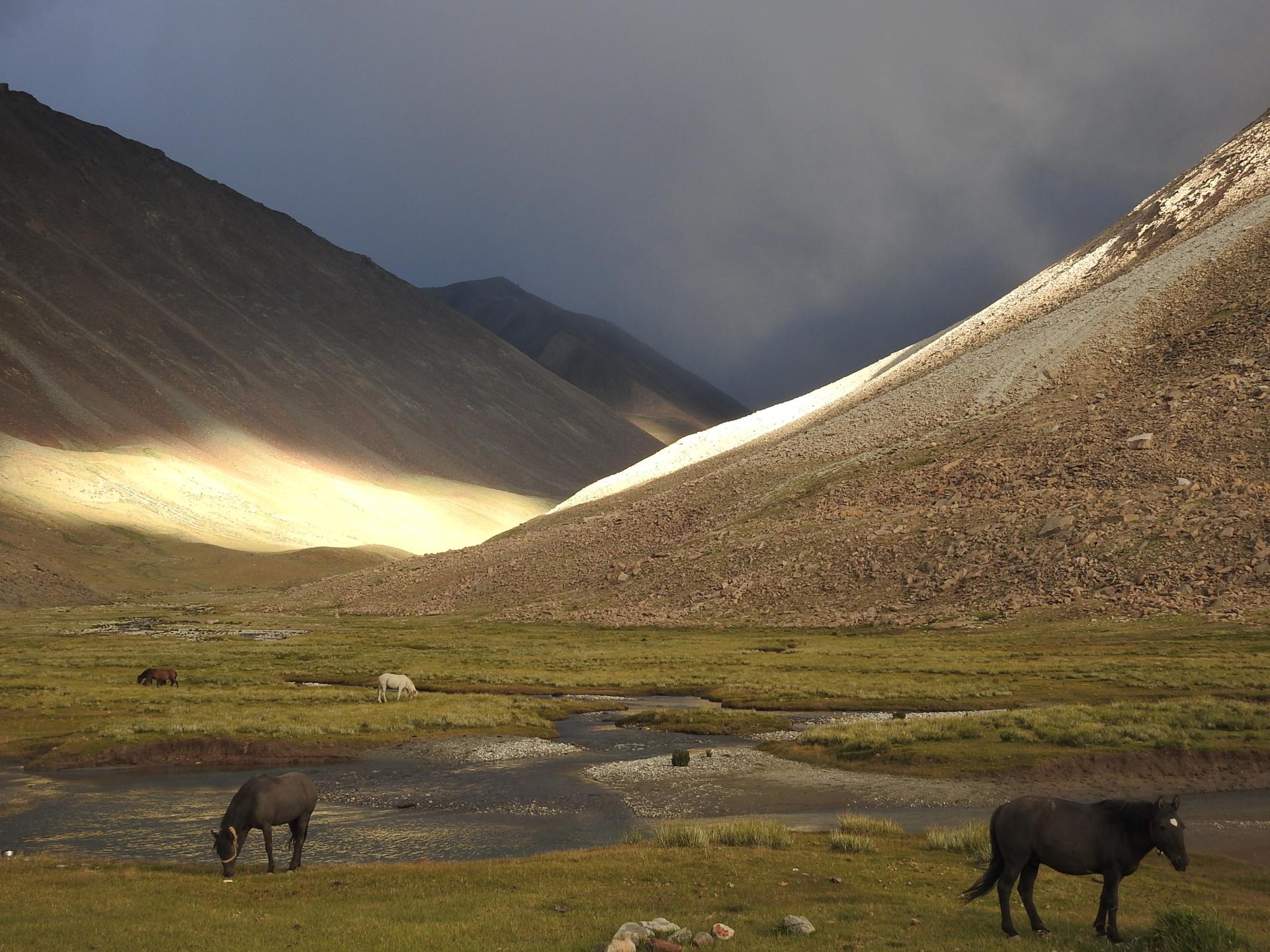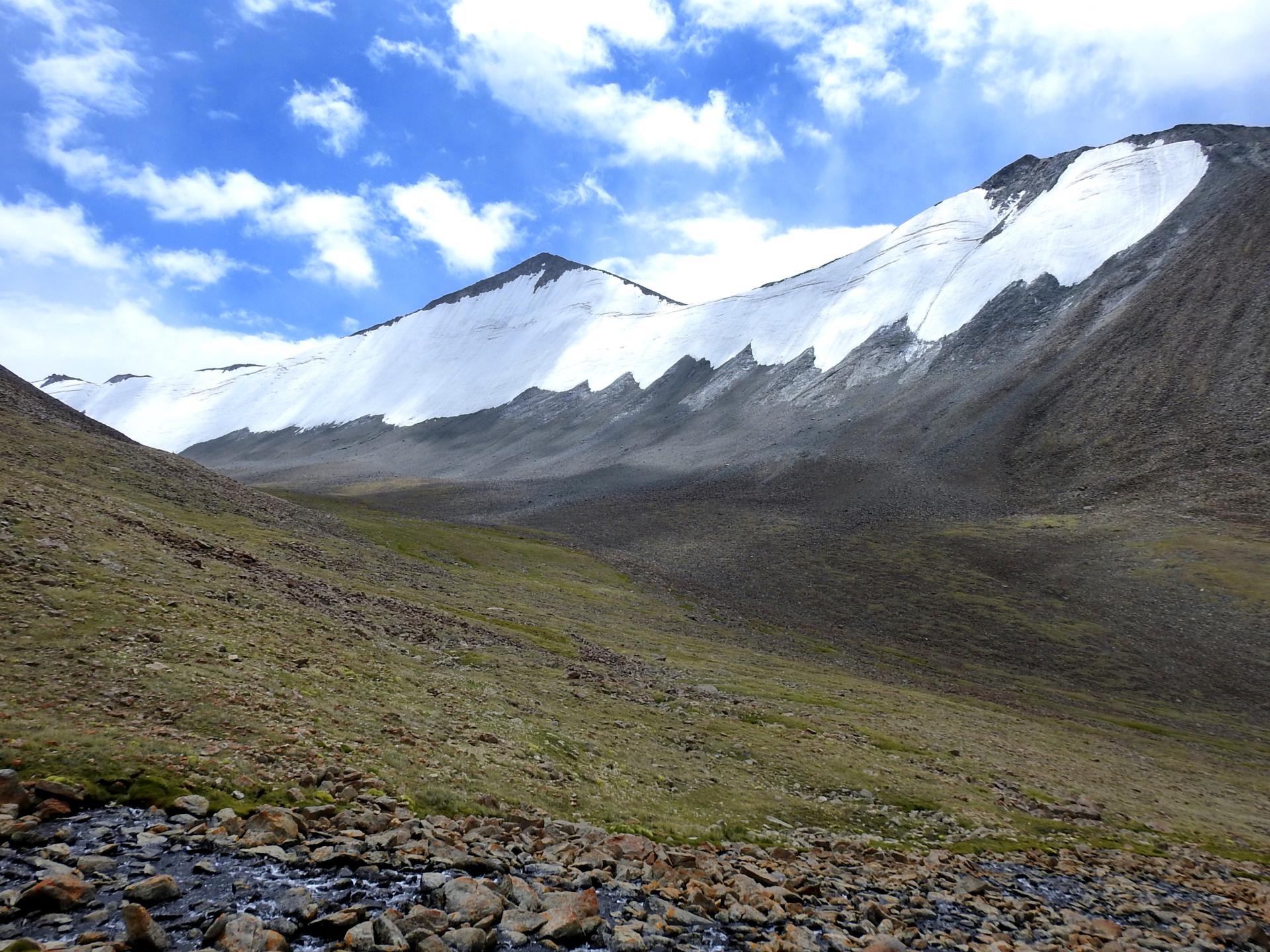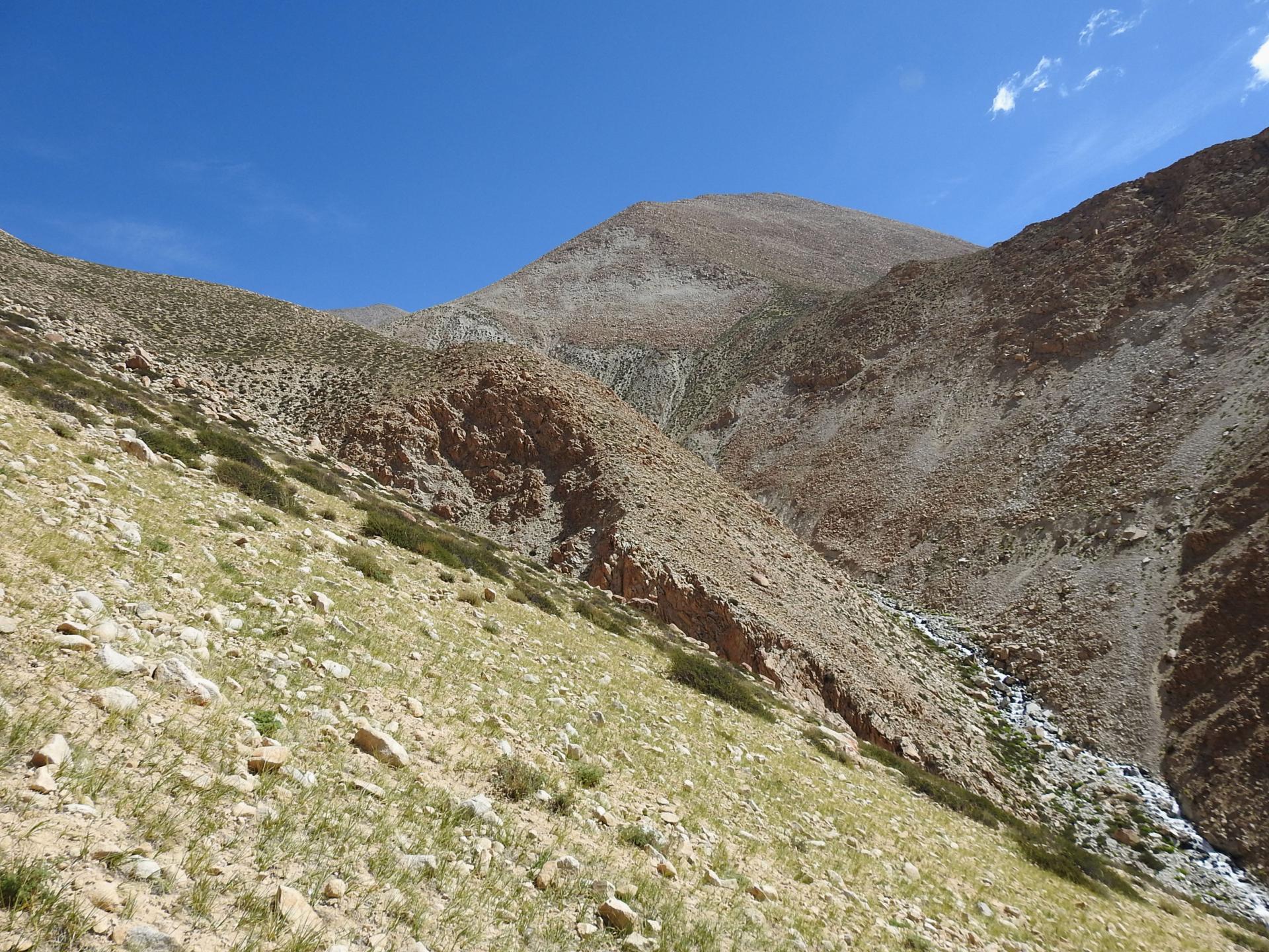 Si l'on n'a rien à faire au village (d'ailleurs il n'y a rien d'autre que 4 maisons, 1 gonpa et 2 champs d'orge et une piste d'accès de 10kms depuis la vallée de l'Indus...), on reste en RG de la rivière pour passer sous les saules et la traverser la seconde rivière qui arrive du vallon de G. On emprunte le chemin qui remonte la large vallée fluviale de la Phichhe Gongma en RG. A 4445m, on croise une source. La vallée semble présenter une pente assez faible mais c'est un leurre ! On s'élève plutôt de belle façon... Le sentier ayant été affecté par de nombreux éboulements de la moraine, on fait de plus en plus de détours sur les banquettes herbeuses le long de la rivière. De part et d'autre de la vallée, les pentes abruptes sont le terrain de jeux de nombreuses colonies de bharals, les moutons bleus de l'Himalaya, parfois de plus d'une centaines de têtes.