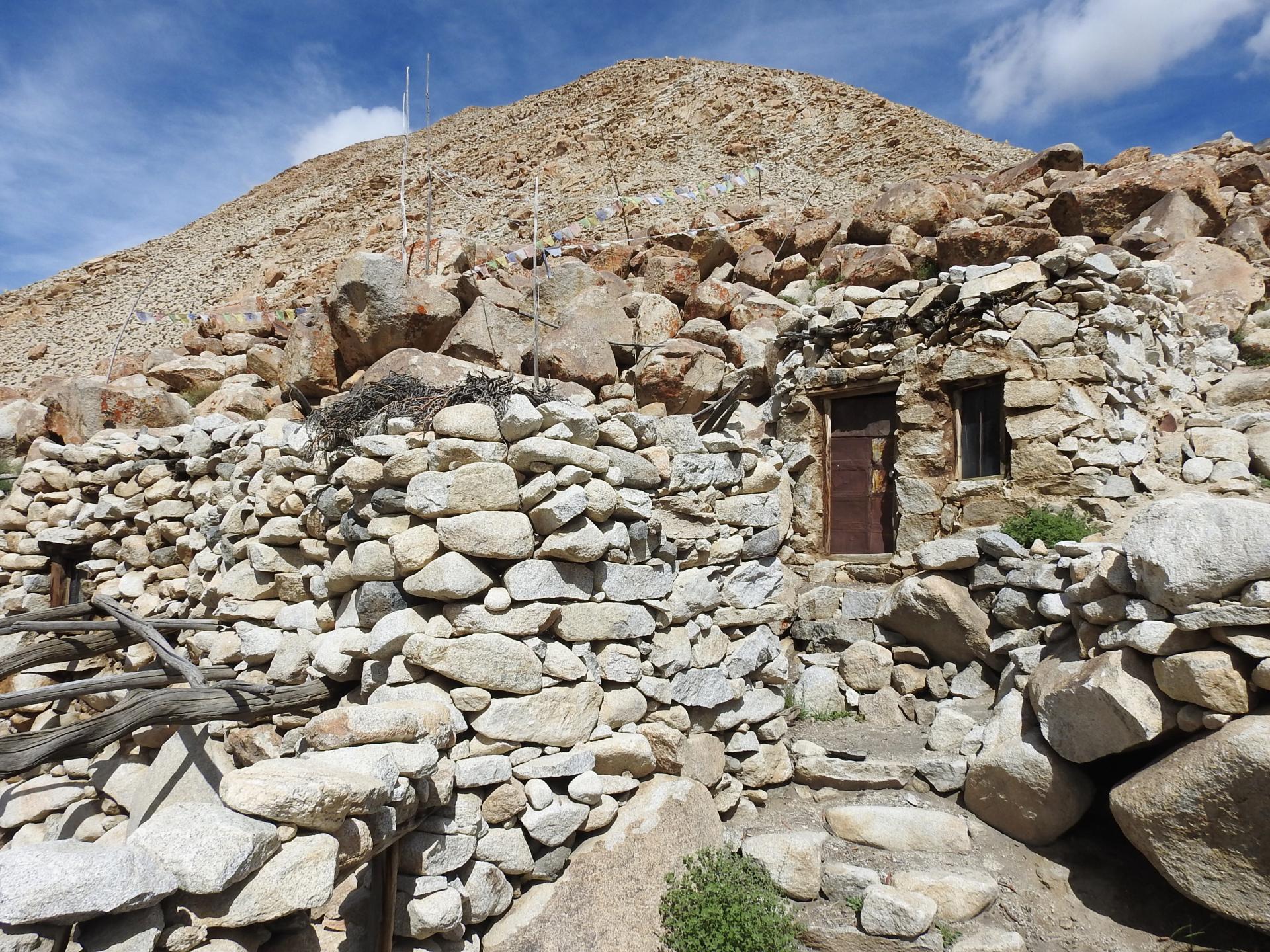 Roang. Il y a le nouveau village avec ses (quelques...) 4 maisons de style ladakhi bien caractéristique : rectangulaires, toits plats, fenêtres de bois ornées... et puis derrière, à la sortie du vallon du Tungyat, c'est l'ancien village, ruiné certes, mais dont les vestiges attestent d'un style de construction bien particulier. Ici, le torrent ne produit que des galets roulés de belle taille. Les murs des habitations ont été édifiés en juxtaposant les galets les uns sur les autres avec un savant équilibre de forces. Et pas de mortier de jointure... Trois ou quatre poutres de peuplier par dessus et on bloque le tout en posant le toit de torchis bordé de coupes de buissons épineux. Et voilà, le travail est fait ! A priori, cela tient comme cela depuis des siècles. A moins d'un séisme...