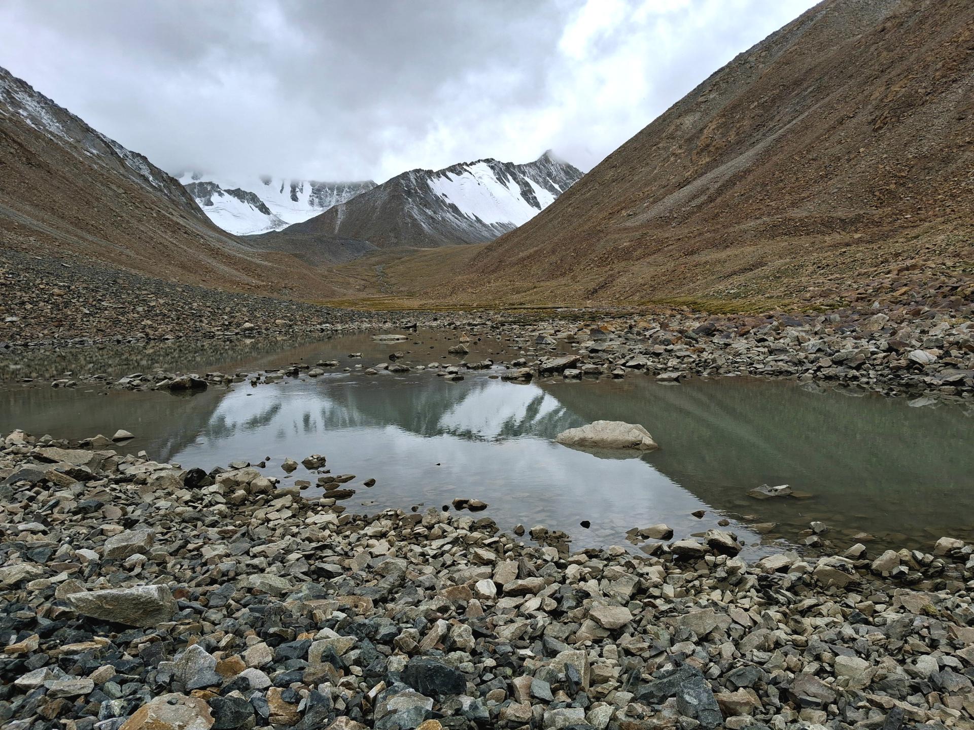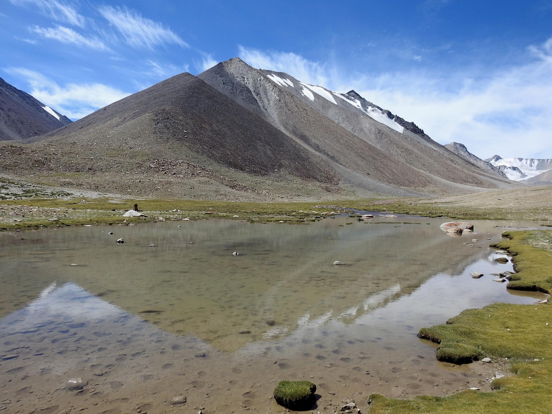 La poursuite de la remontée va s'effectuer sur des plateaux herbeux faiblement inclinés mais il va falloir tout d'abord traverser le petit torrent exutoire juste à la sortie d'un vallon émissaire qui arrive de la gauche. On passe sous le dernier mamelon morainique, tout petit celui-là, pour rejoindre côté S le cairn composé de roches plates de granit et de mottes de tourbe empilées. Cela nous prépare à la suite... (30mn, 5240m). Caché derrière le mamelon, on découvre avec bonheur un laquet naturel dans lequel on peut admirer vers le N le reflet des pics de la Pangong range et vers le S les pics détritiques qui bordent la vallée.