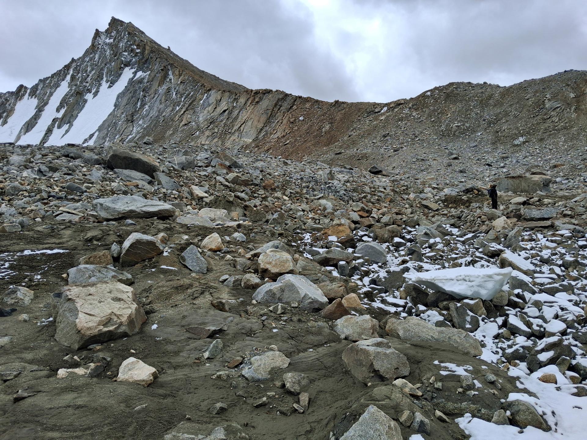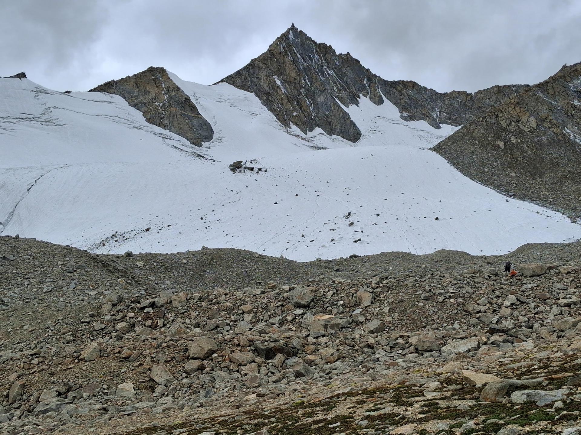 On peut poursuivre légèrement à main G pour rejoindre le col sans nom. On louvoie au mieux dans les pentes morainiques. Autrefois, c'était un passage muletier. Il s'est dégradé au fur et à mesure du recul des glaciers et aussi du désintérêt des locaux à le franchir pour descendre vers la vallée de l'Indus. Il est aujourd'hui impraticable pour les mules et pas loin de l'être pour les humains vu les risques de chutes de pierres... (1h10, 5725m)