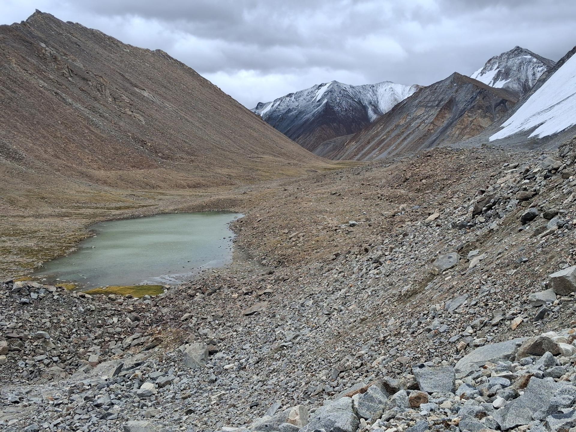 Le bivouac se situe au SE du lac et tout juste à la sortie de la vallée que l'on va remonter demain pour rejoindre les lacs qui se situent à proximité du Kaksar La (2h30, 4375m, eau dans le lac, C AIRTEL, BSNL, JIO, GPS : 33°34'24"N 78°37'18"E).