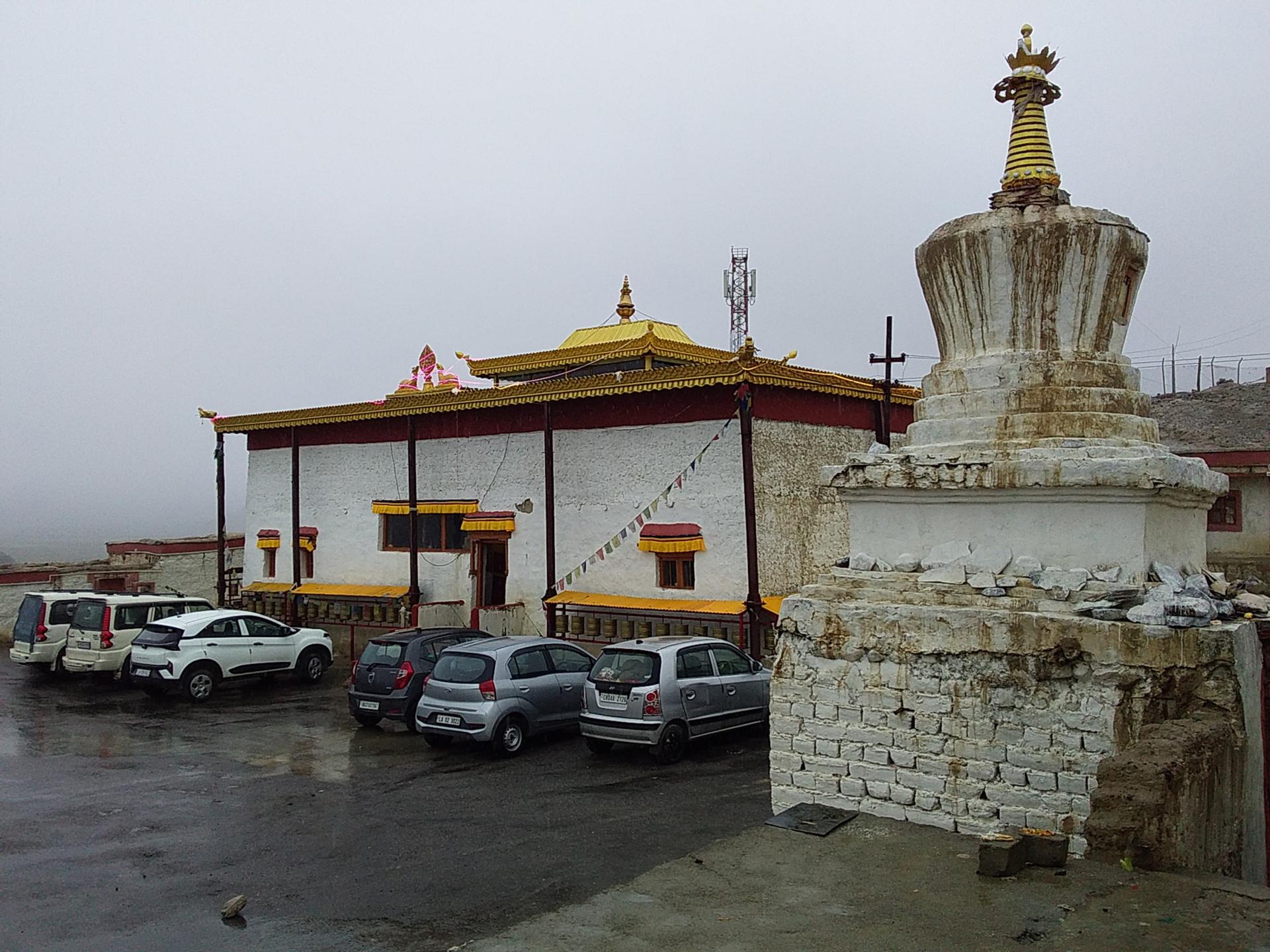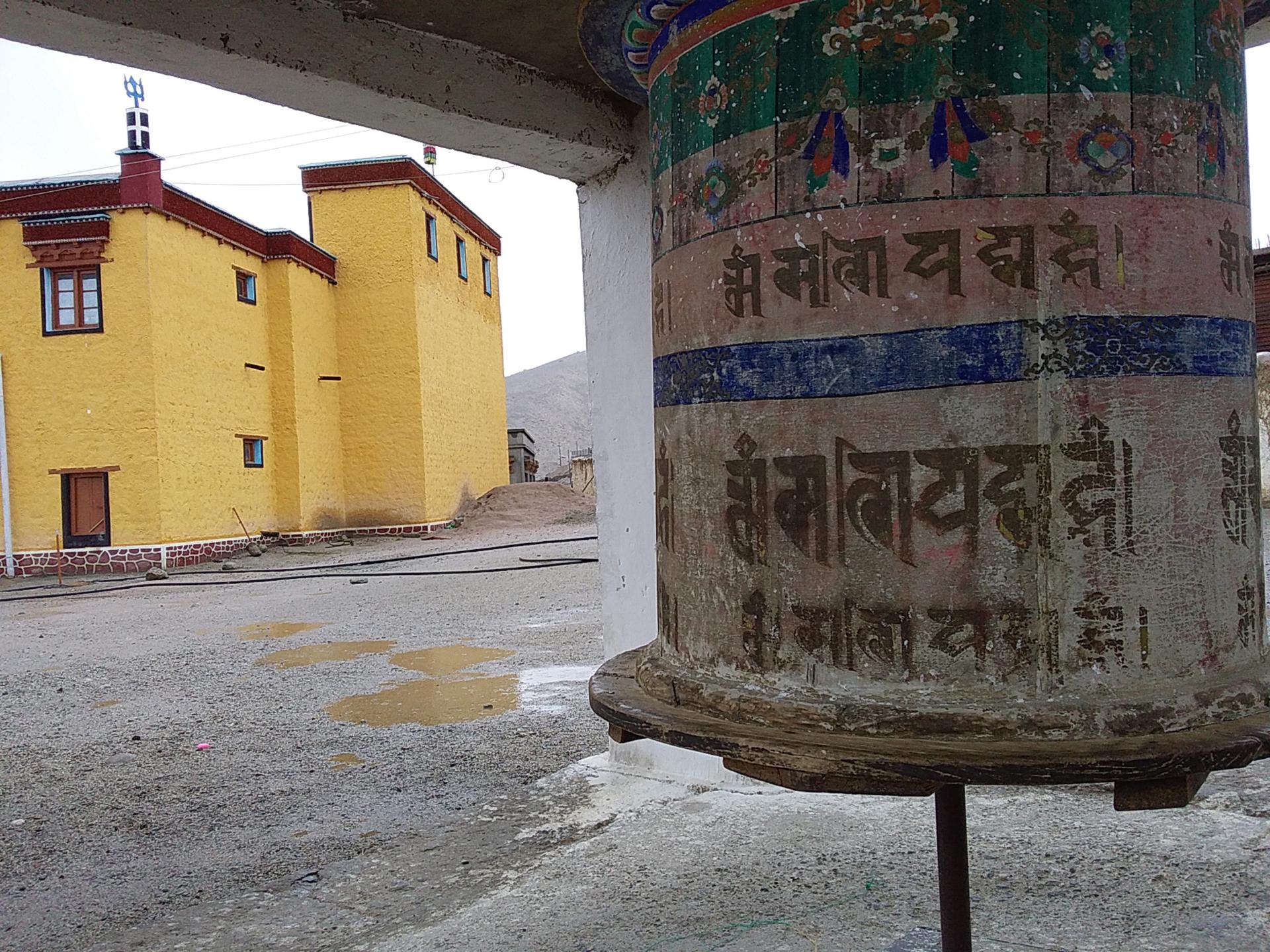 Quant aux marcheurs, aujourd'hui, c'est visite de Chushul Gonpa et de ses environs... en voiture. Tout d'abord, montée au gonpa de Chushul perché sur son monticule et entouré des 3 pylônes de télécom. Pas vraiment heureux comme site... Par contre, l'accueil des moines est très sympathique car ils ne voient pas passer beaucoup de monde. Le lieu de prières est ténu : 2 pièces étroites aux portes basses aux murs richement décorés de peintures anciennes.
