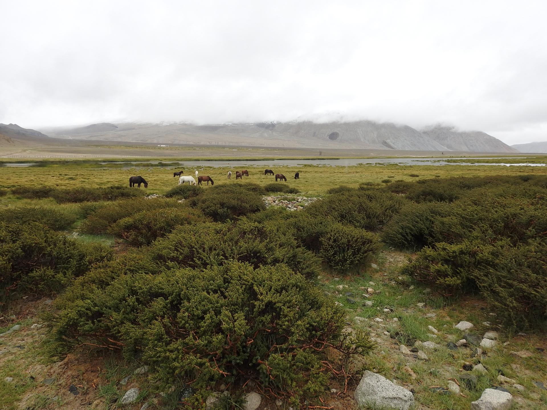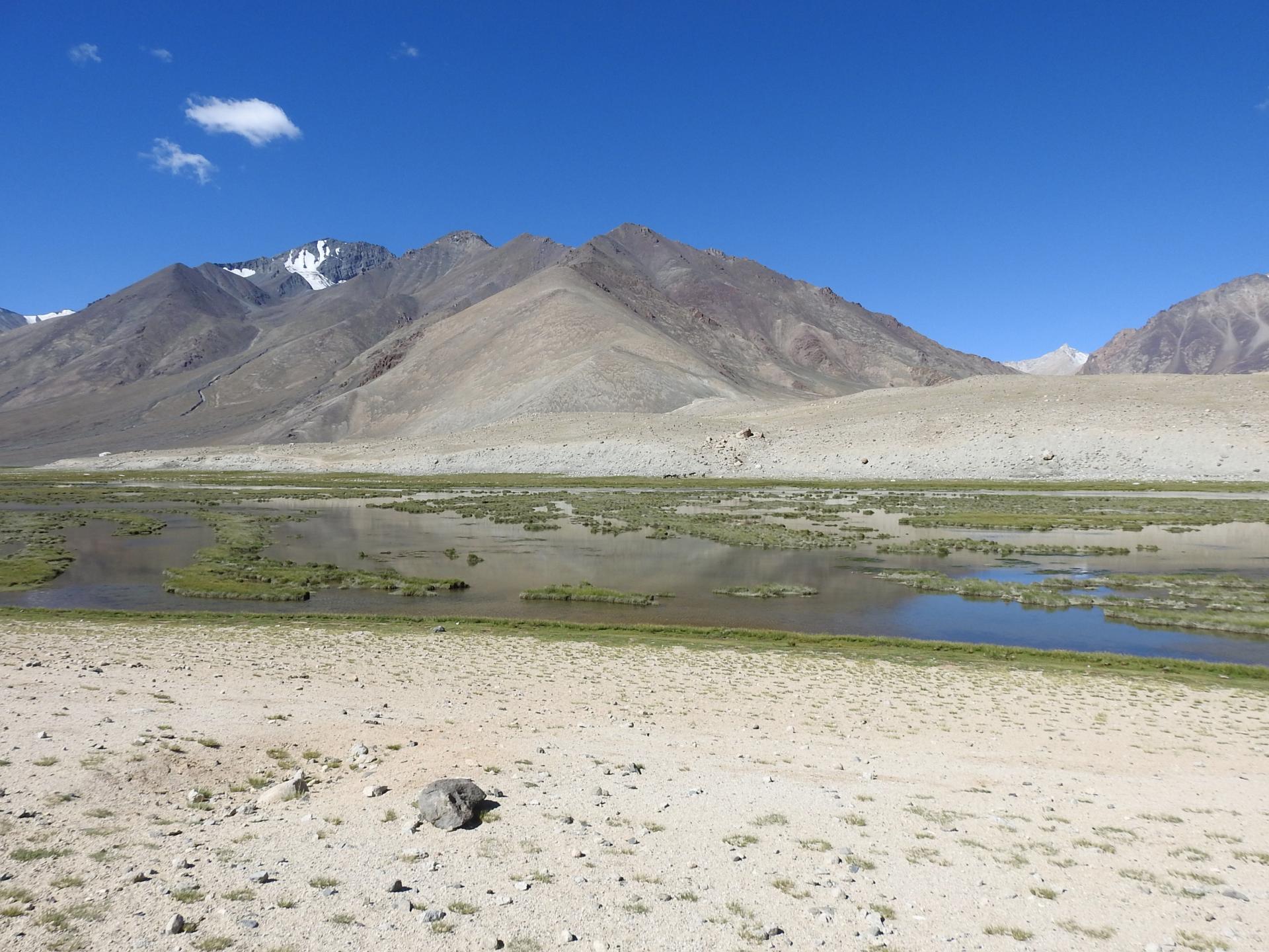 Déplacement du camp par le staff et les muletiers de 6kms vers le SE pour rejoindre une étendue de verdure qui jouxte le lac de Chushul (réserve naturelle pour les grues à tête noire et les oies bernaches de passage). Attention ! Sur le trajet, il est nécessaire de traverser la Har Togpo ; en période de crue suite à de violentes pluies, le franchissement est problématique rapport à la hauteur d'eau et au fort courant (prévoir chaussures aquatiques, bâtons et short...).