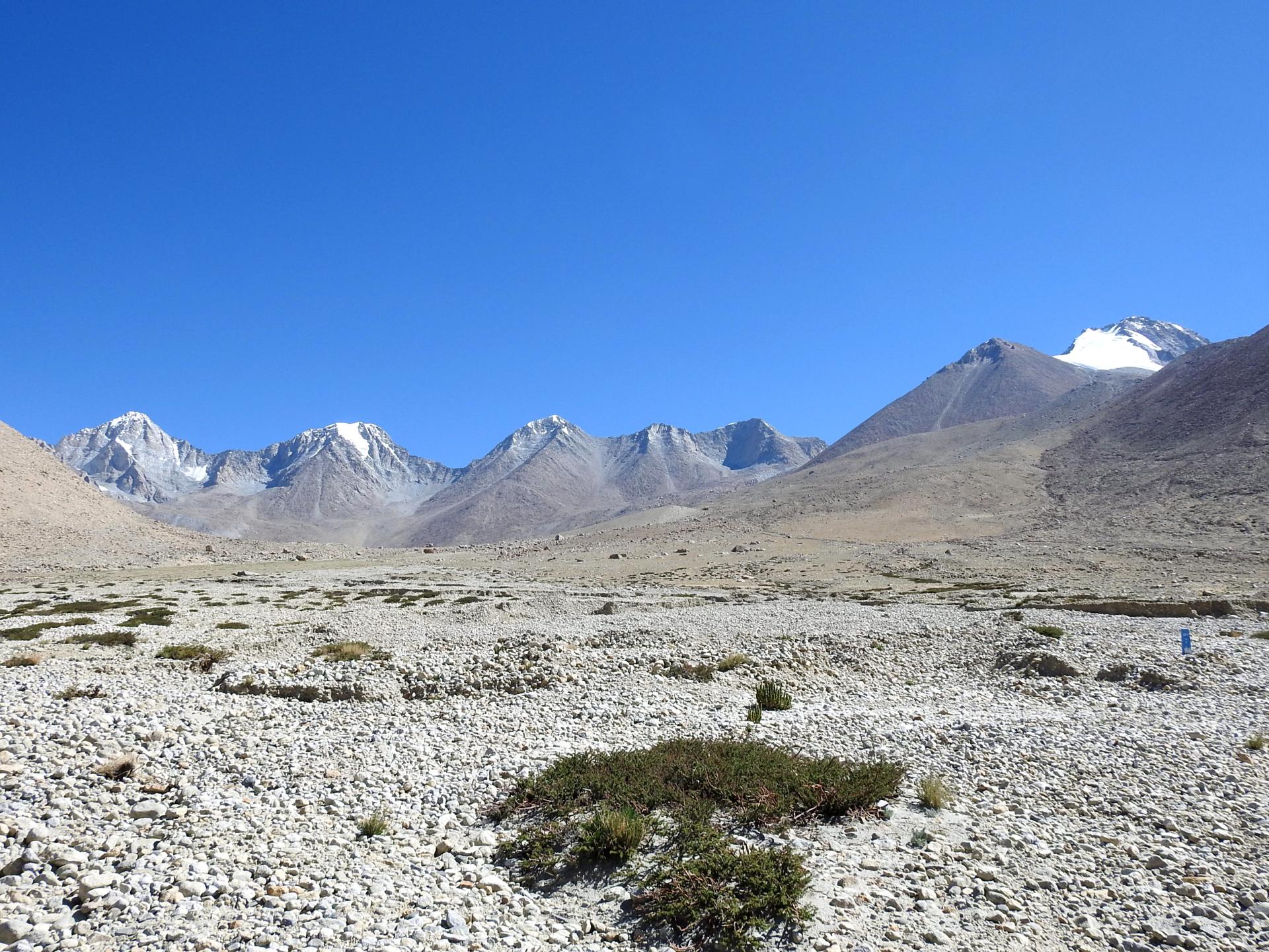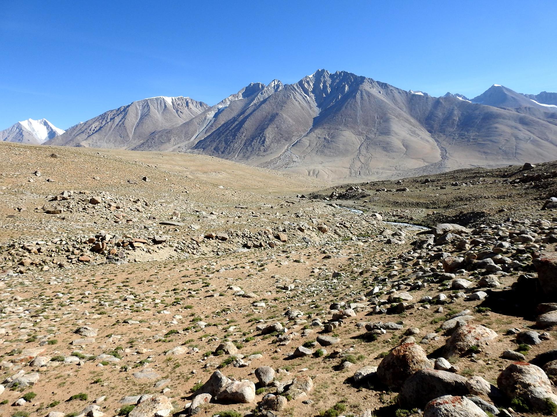 On poursuit la remontée de la vallée qui présente une déclivité insignifiante. Le cirque glaciaire du fond de la vallée doit se rapprocher mais de prime abord cela ne semble pas si évident que cela... On traverse un gros éboulis puis on continue à jouer à saute-rochers sur les blocs qui recouvrent le lit de la rivière (pour ceux qui aiment, c'est cent fois plus sympa que les tourbières !). On atteint le rebord d'un plateau mi-herbeux mi-tourbières et c'est là que l'on établit le camp (50mn, 5340m, eau dans la rivière, herbe à satiété pour les mules, GPS : 33°37'43"N 78°25'48"E). A l'arrière, le panorama sur la Pangong range s'est réduit à un seul pic qui jusqu'à présent était caché derrière le Kangju Kangri. Alors, bienvenue à lui : le Karkset qui, avec ses 6660m, est le sommet le plus haut de la chaîne.