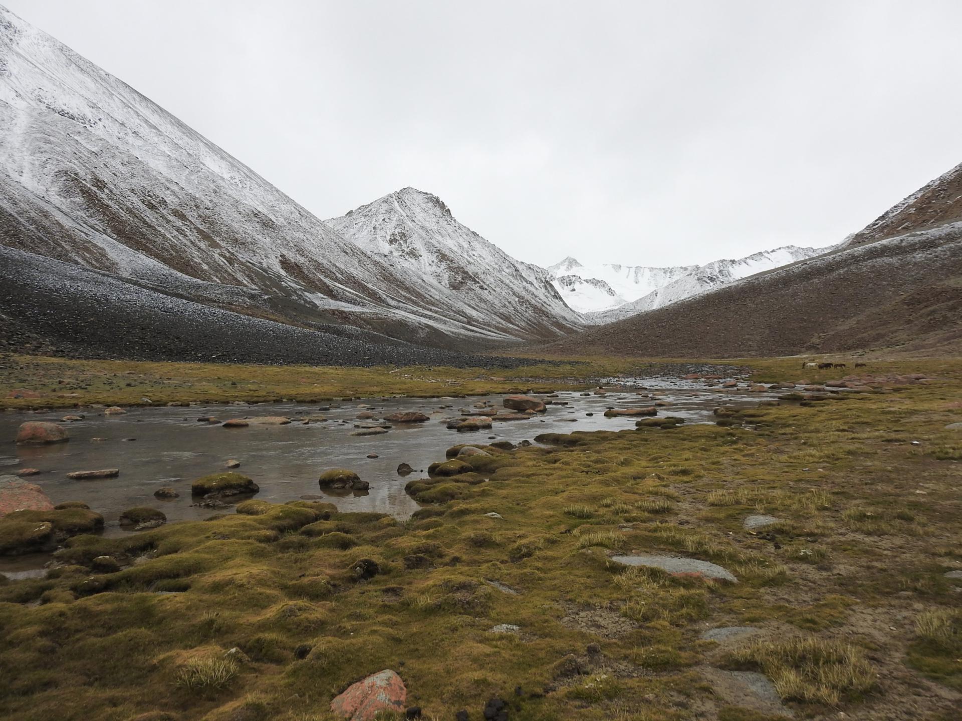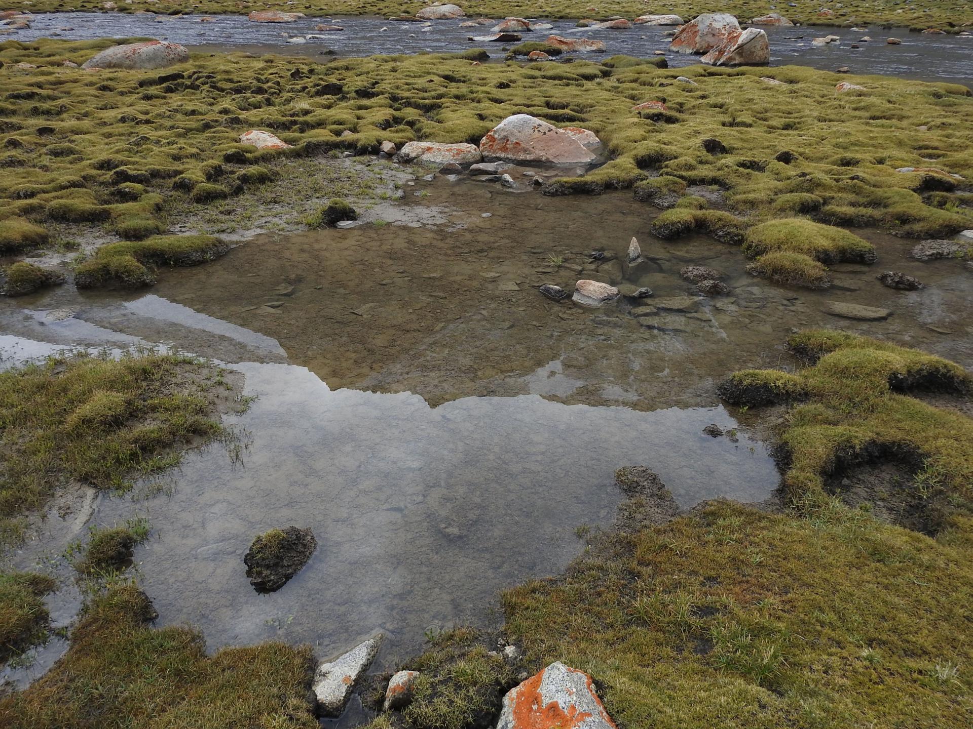 Et c'est reparti en direction du fond de la vallée ! On se trouve toujours en RD de la Kailung Togpo et revoici les célèbres tourbières du Changthang ! Comme cela commence à être lassant et qu'en jetant un coup d’œil sur la RD on a repéré que le terrain semblait plus sec et moins bosselé, on traverse la rivière sur des pierres émergées (10mn, 5255m) pour tenter de rejoindre un terrain moins hostile. Mais c'est un leurre... Certes, on va éviter la traversée des gros éboulis qui suivaient les tourbières de la RD mais, côté tourbières, la RG en est aussi richement dotée !