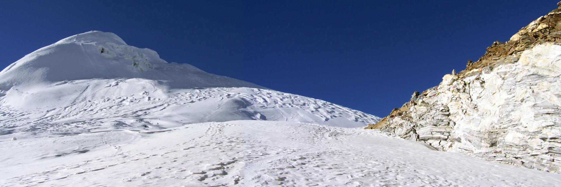 Ascension de niveau alpin PD+ sur un sommet qui culmine à 6272m. Elle s’effectue sur de la neige glacée avec nécessité de franchir un « mur » de 40 à 50° au milieu de la montée ainsi qu’une rimaye à l’aplomb du sommet (plus ou moins large selon les années) et une arête en neige pour finir. Donc, il est impératif de se doter de tout l’équipement de haute-montagne (piolet, crampons, baudrier, corde de 50m), de ne pas partir seul et d’emporter le matériel nécessaire pour se sortir d’une crevasse. A éviter d’entreprendre par grand vent (il est latéral dans le coin). Sinon, splendide belvédère sur les montagnes du Khumbu et du Rolwaling de part et d’autre, c’est ce qui nous manquait au col pour être entièrement comblés…