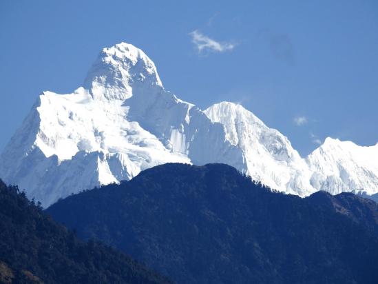 Belle vue plongeante sur le sillon tracé par la Tamur khola. Tout au fond, à gauche du Jannu, apparaît le Jhinsang peak qui marque le point de convergence des frontières du Népal, de l'Inde et du Tibet. On incline légèrement sur la D pour s'engager plus loin sur le fil d'un rein en forêt non démaquisée. On franchit dans la longueur un petit collet à découvert (25mn, 2915m) où l'on poursuit tout droit (attention, départs de sentiers à gauche puis à droite à ne pas suivre !) pour se confronter à une remontée bien cassante sur le fil de la crête. Eprouvante car dans une végétation invasive et la chaleur du milieu d'après-midi... On remonte ainsi jusqu'à 2970m avant de retrouver un chemin plus large en forêt. On se croirait sur les sentiers de l'Île de la Réunion ! On passe un belvédère situé côté S de la crête et on suit le rebord du coteau à découvert après un bref passage en forêt.